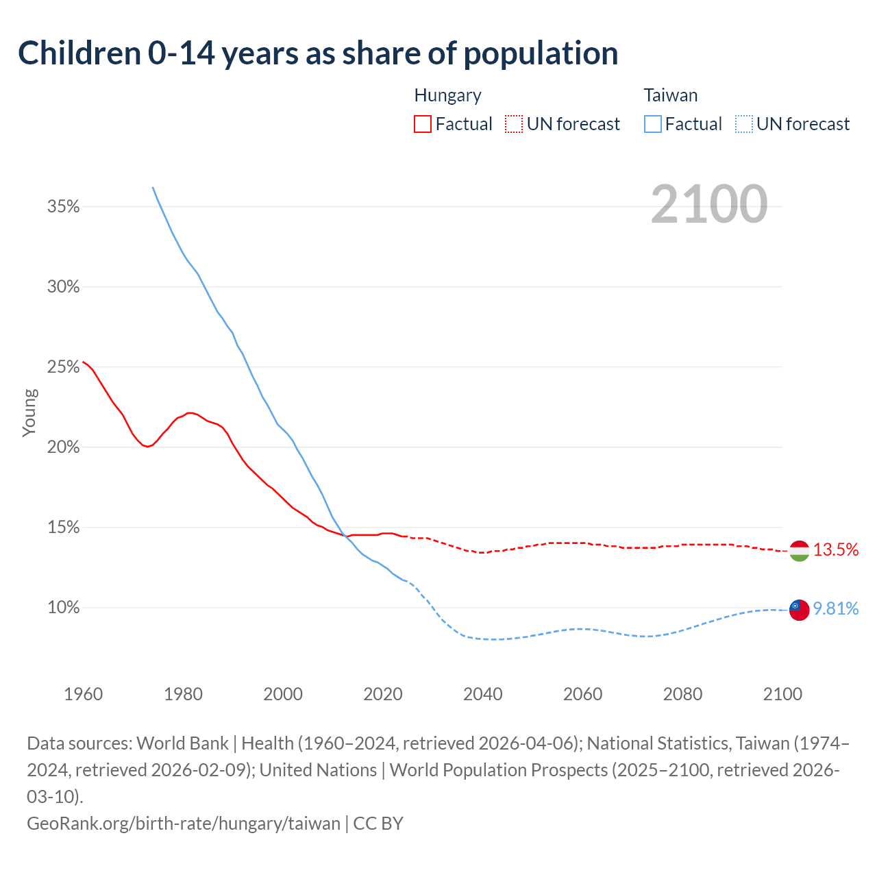 Children aged 0-14 make up 14.4% of the population in Hungary and 11.7% in Taiwan in 2024, compared to 20.2% and 27.1% respectively in 1990.