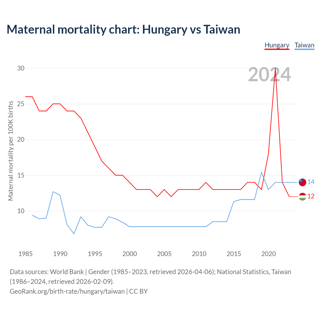 The maternal mortality rate, which is the probability of dying during childbirth or within 42 days of pregnancy termination, is 12 deaths per 100,000 live births in Hungary, compared to 14 deaths in Taiwan.