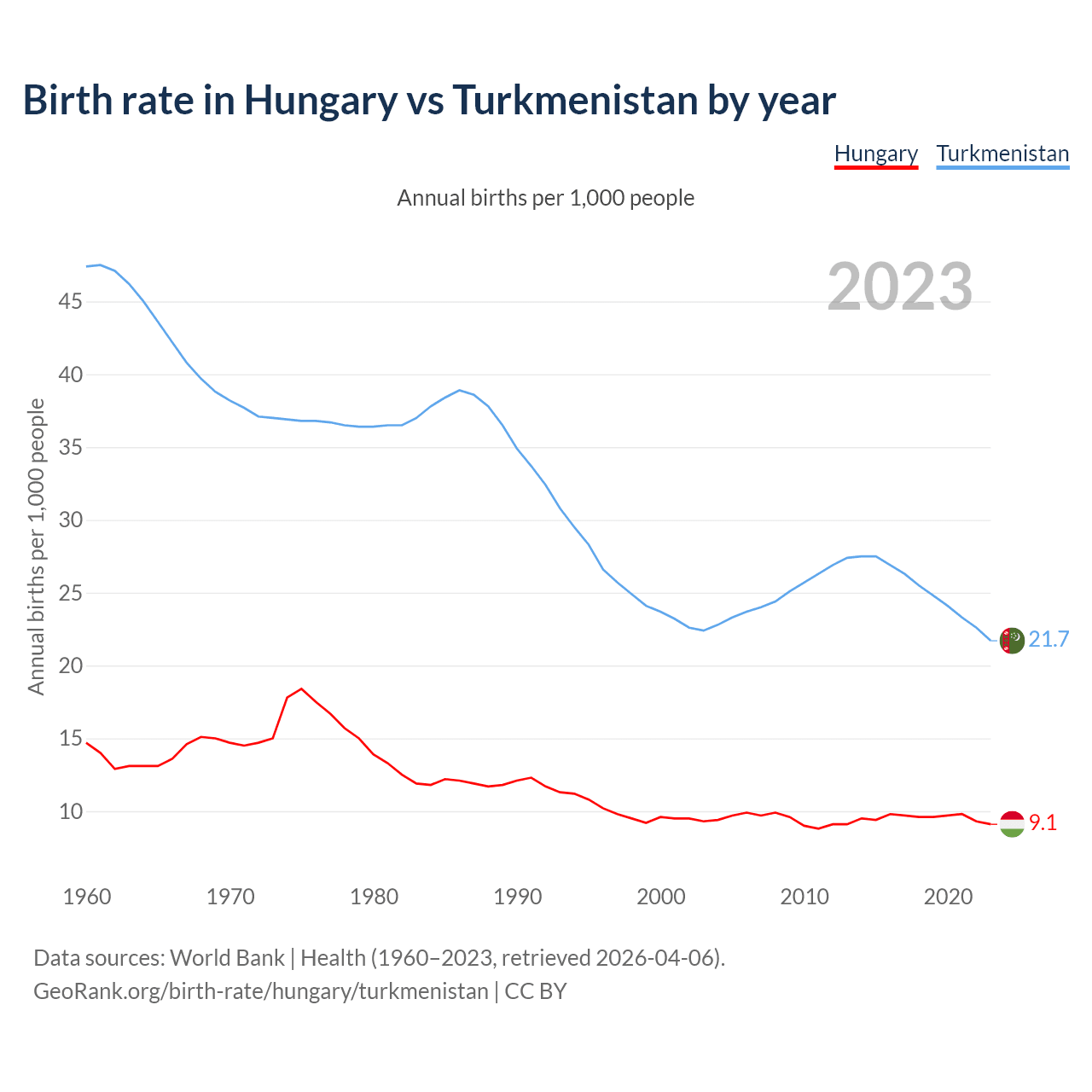 Hungary has an annual birth rate of 9.1 births per 1,000 people, compared to 21.7 for Turkmenistan. The average number of children a woman is expected to have during her lifetime — the fertility rate, is 1.51 in Hungary and 2.69 in Turkmenistan — 78.1% difference.