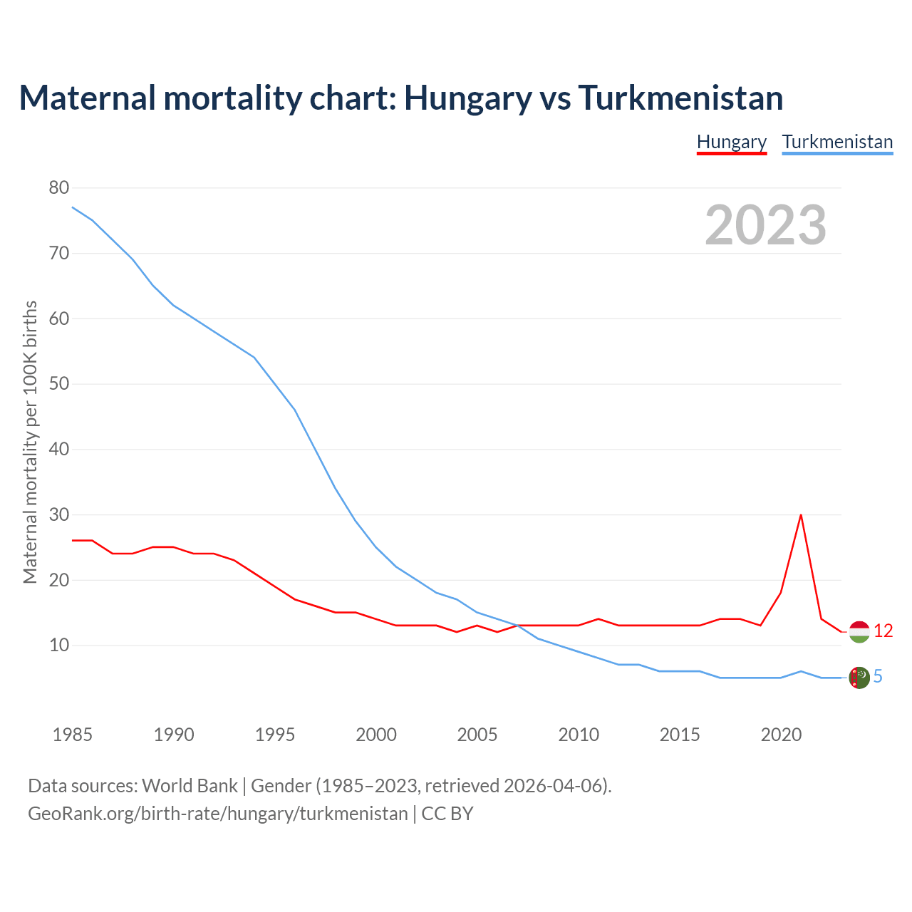 The maternal mortality rate, which is the probability of dying during childbirth or within 42 days of pregnancy termination, is 12 deaths per 100,000 live births in Hungary, compared to 5 deaths in Turkmenistan.