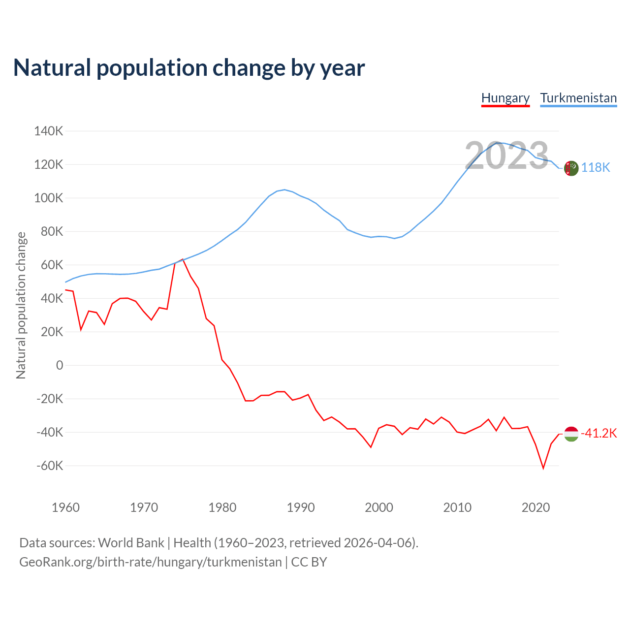 According to the latest available data on birth rates, the fertility rate in Hungary was 1.51 children per woman in 2023, compared to 2.69 in Turkmenistan in 2023. The replacement level is considered to be 2.1 children per woman.