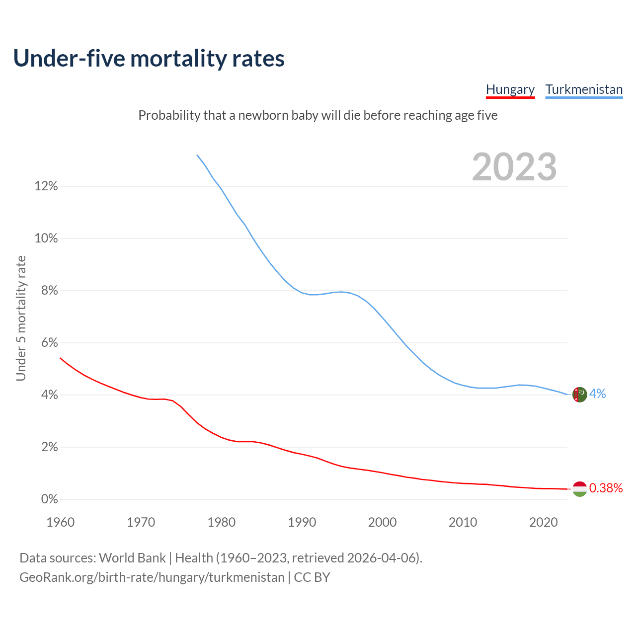 The chance that a newborn baby will die before reaching age five is 0.38% in Hungary and 4% in Turkmenistan. Above is a chart with historical data on under-five mortality rates.