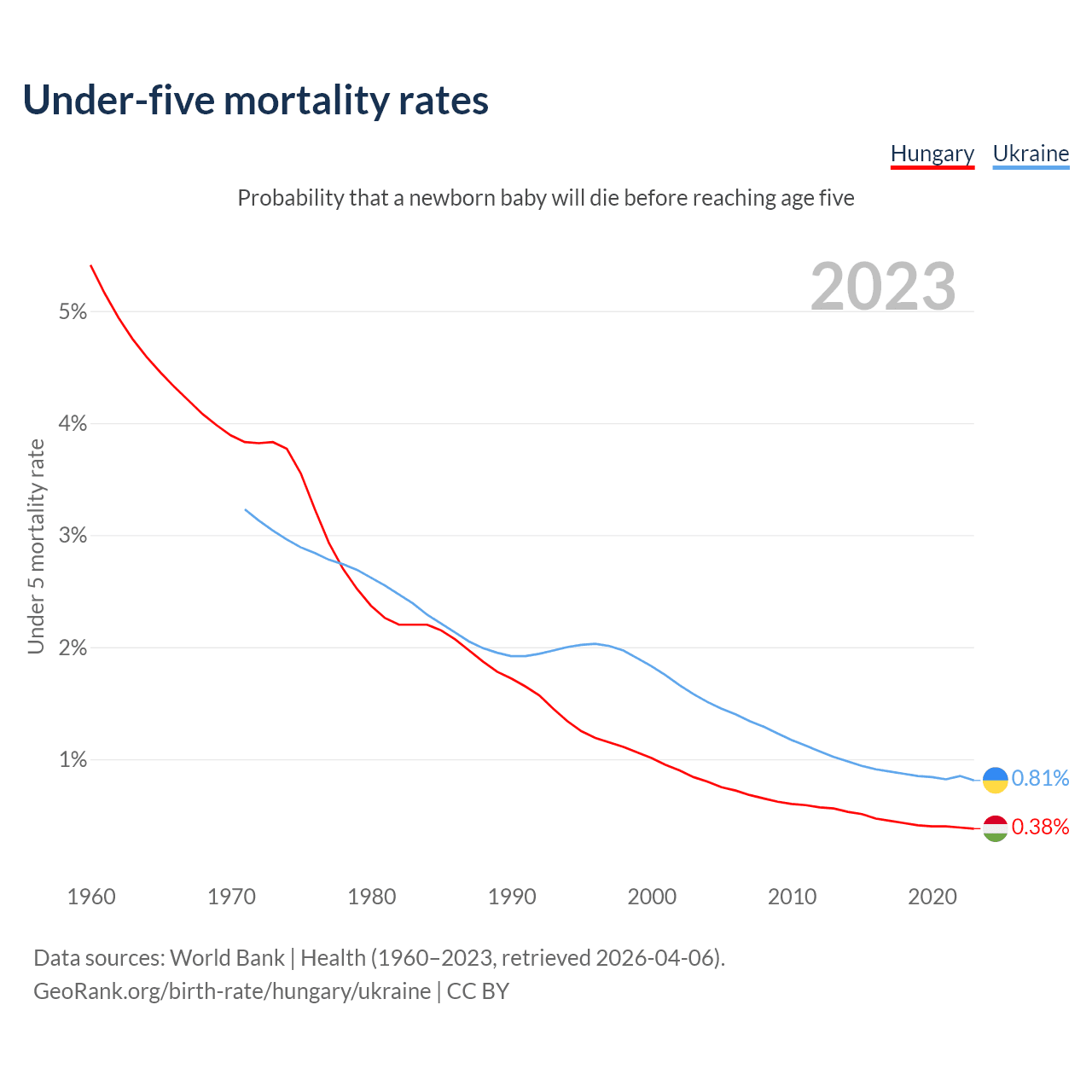 The chance that a newborn baby will die before reaching age five is 0.38% in Hungary and 0.81% in Ukraine. Above is a chart with historical data on under-five mortality rates.