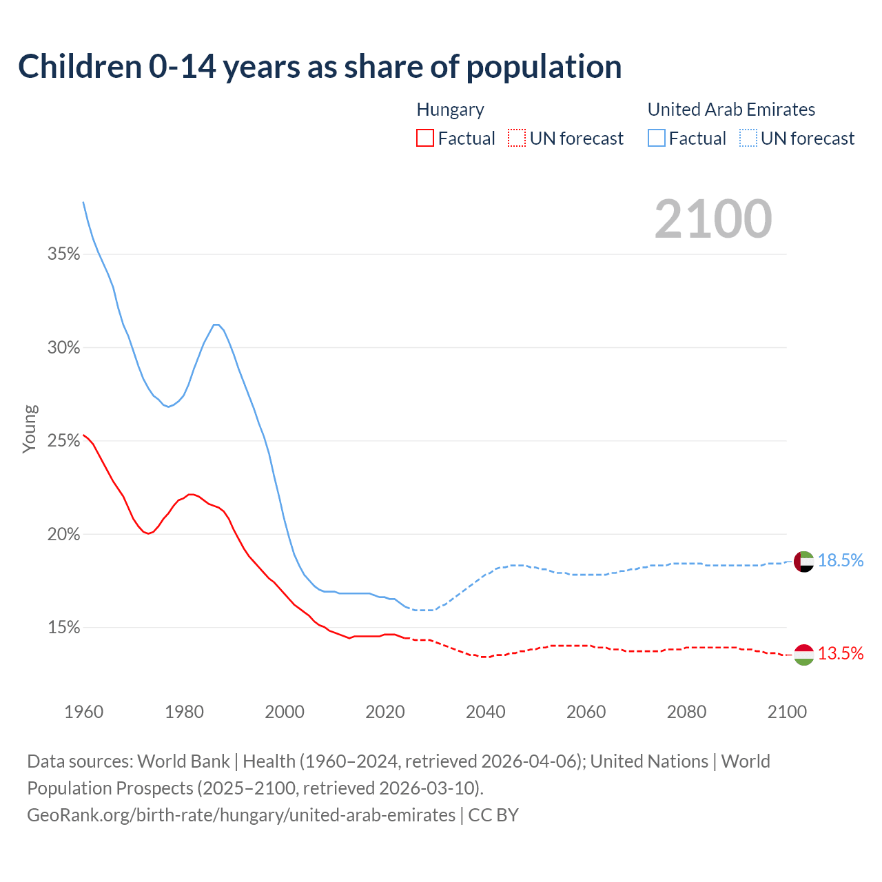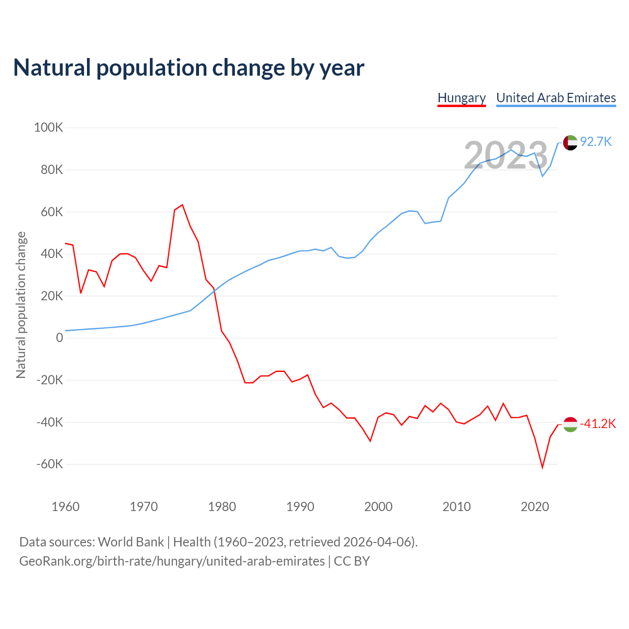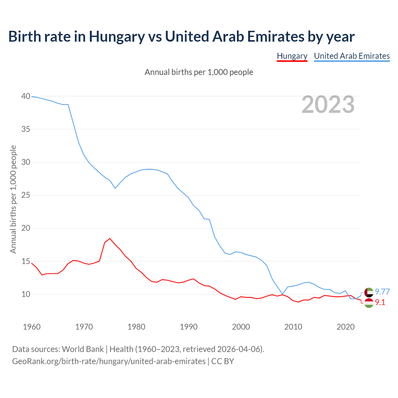 Hungary has an annual birth rate of 9.1 births per 1,000 people, compared to 9.77 for the United Arab Emirates. The average number of children a woman is expected to have during her lifetime — the fertility rate, is 1.51 in Hungary and 1.2 in the United Arab Emirates — 20.5% difference.