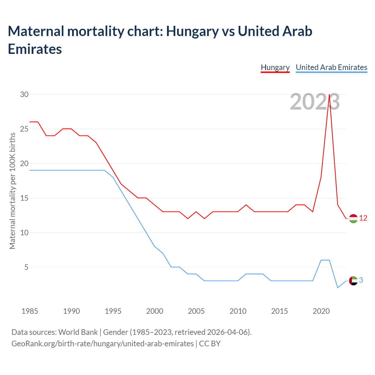The maternal mortality rate, which is the probability of dying during childbirth or within 42 days of pregnancy termination, is 12 deaths per 100,000 live births in Hungary, compared to 3 deaths in the United Arab Emirates.