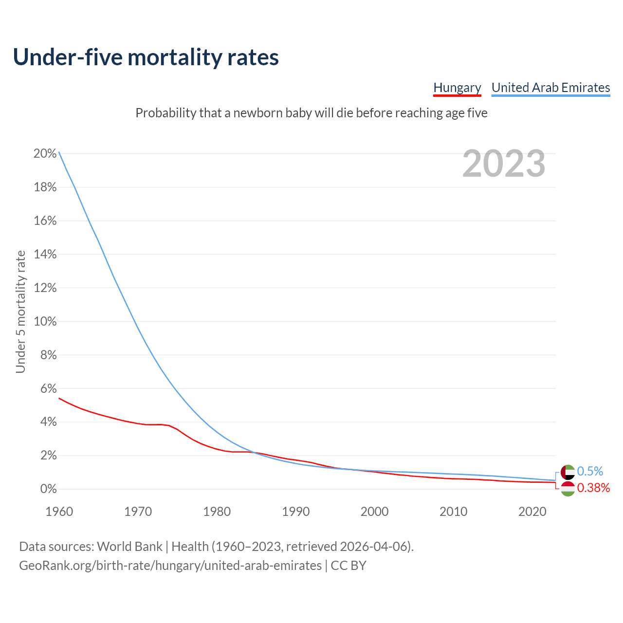 The chance that a newborn baby will die before reaching age five is 0.38% in Hungary and 0.5% in the United Arab Emirates. Above is a chart with historical data on under-five mortality rates.