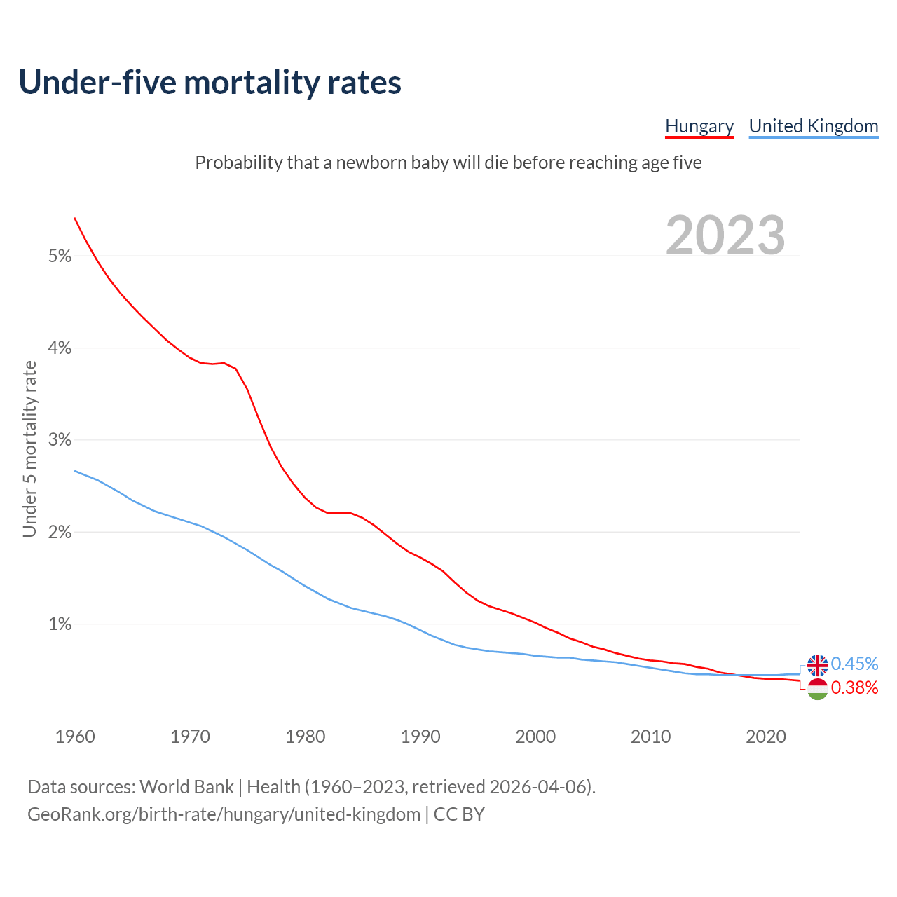 The chance that a newborn baby will die before reaching age five is 0.38% in Hungary and 0.45% in the United Kingdom. Above is a chart with historical data on under-five mortality rates.