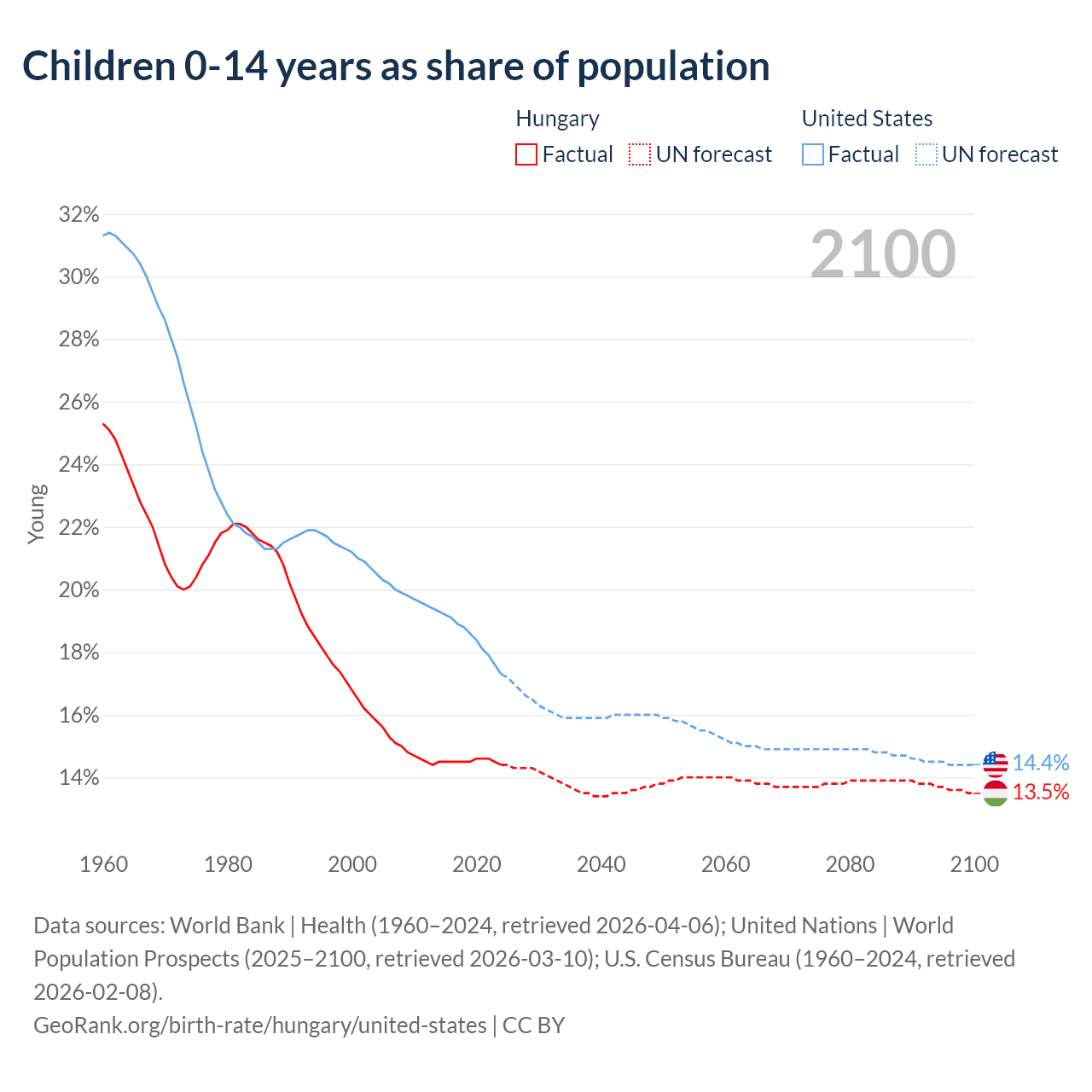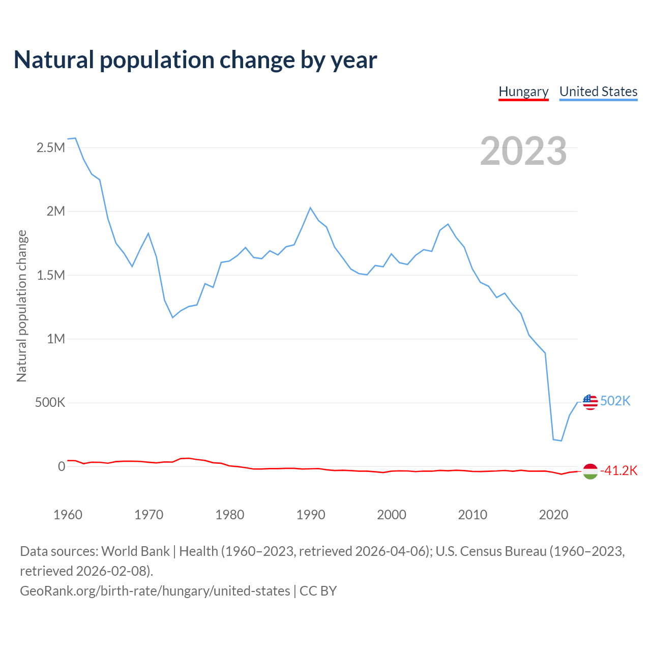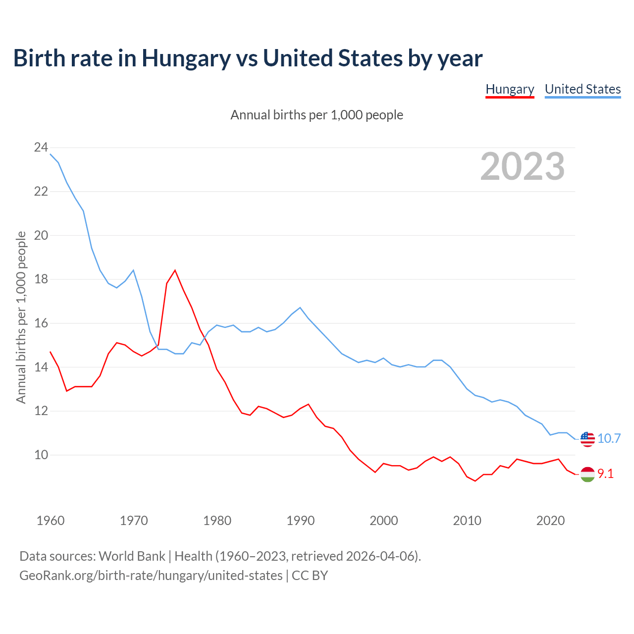 According to the latest available data on birth rates, the fertility rate in Hungary was 1.51 children per woman in 2023, compared to 1.62 in the United States in 2023. The replacement level is considered to be 2.1 children per woman.
