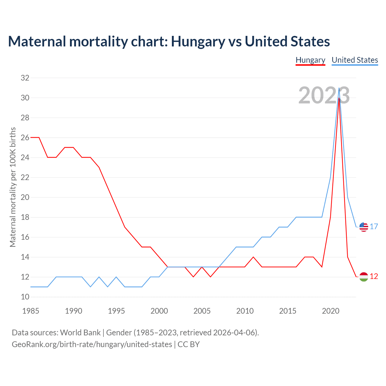 The maternal mortality rate, which is the probability of dying during childbirth or within 42 days of pregnancy termination, is 12 deaths per 100,000 live births in Hungary, compared to 17 deaths in the United States.