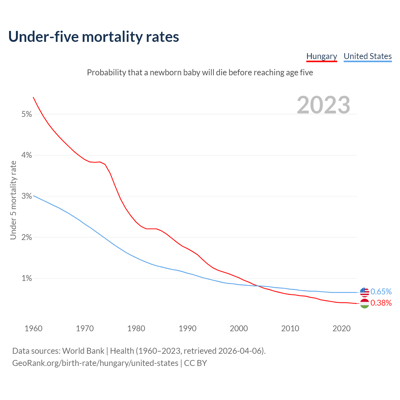 The chance that a newborn baby will die before reaching age five is 0.38% in Hungary and 0.65% in the United States. Above is a chart with historical data on under-five mortality rates.