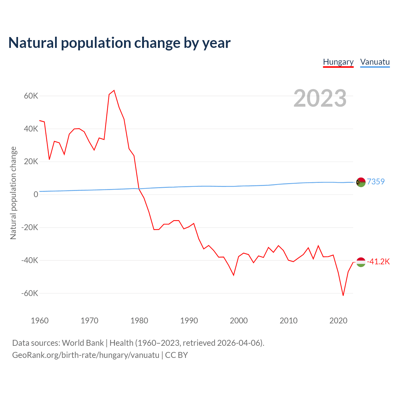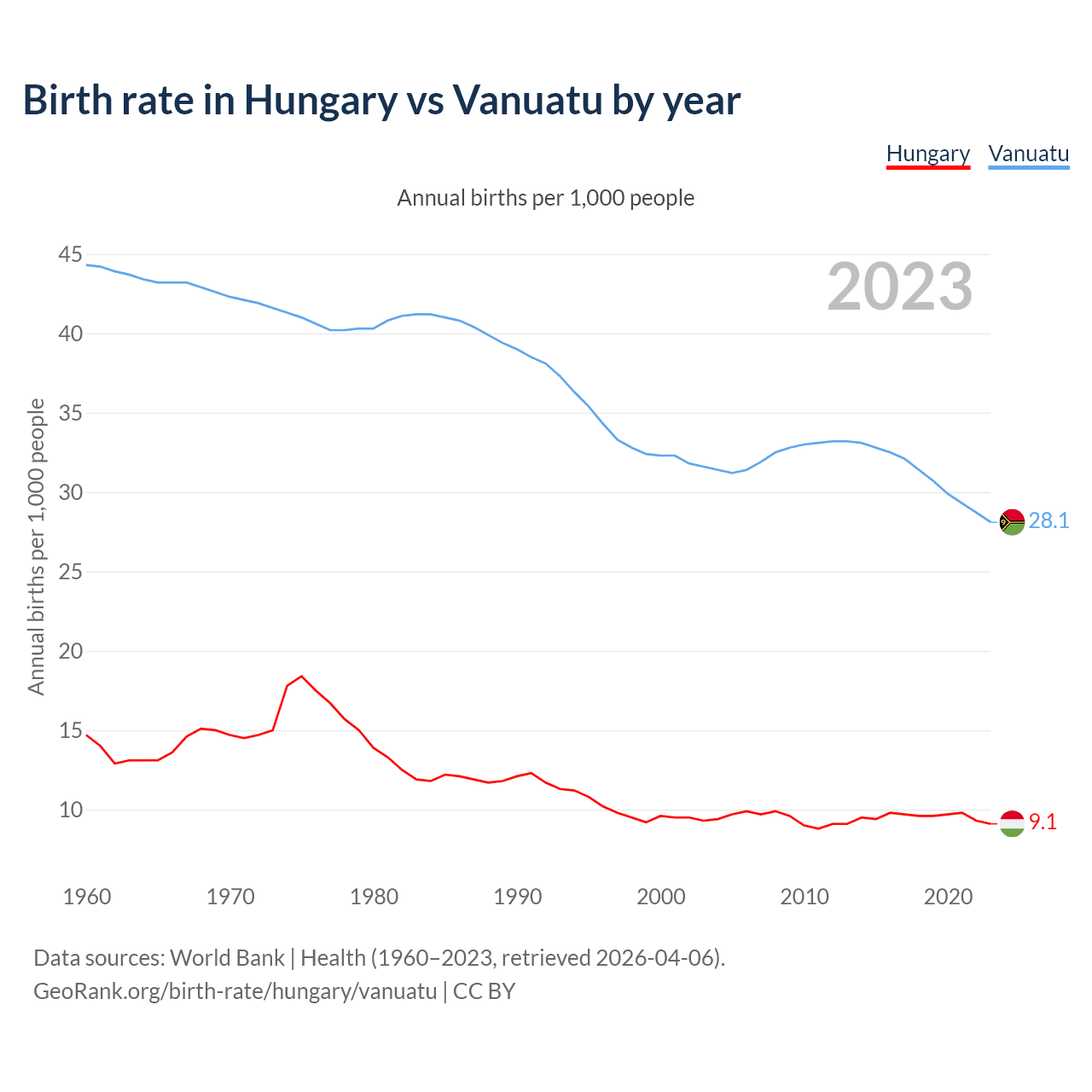 Hungary has an annual birth rate of 9.1 births per 1,000 people, compared to 28.1 for Vanuatu. The average number of children a woman is expected to have during her lifetime — the fertility rate, is 1.51 in Hungary and 3.6 in Vanuatu — 138.1% difference.