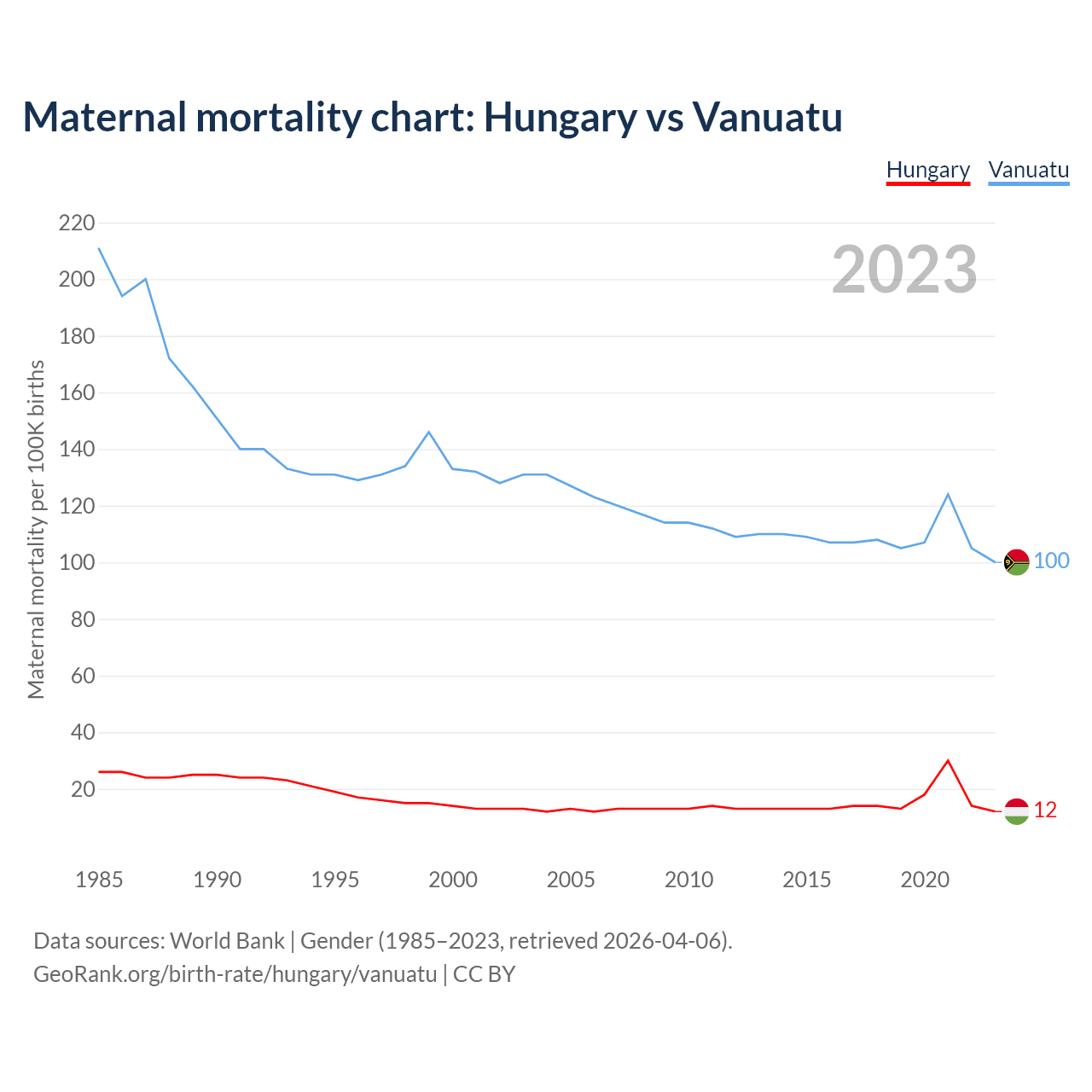The maternal mortality rate, which is the probability of dying during childbirth or within 42 days of pregnancy termination, is 12 deaths per 100,000 live births in Hungary, compared to 100 deaths in Vanuatu.