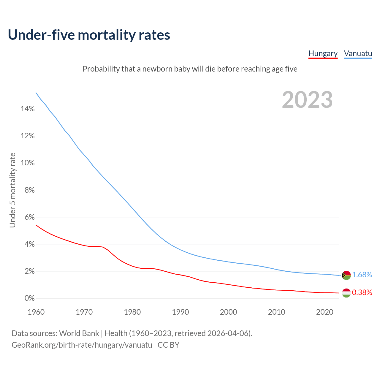 The chance that a newborn baby will die before reaching age five is 0.38% in Hungary and 1.68% in Vanuatu. Above is a chart with historical data on under-five mortality rates.