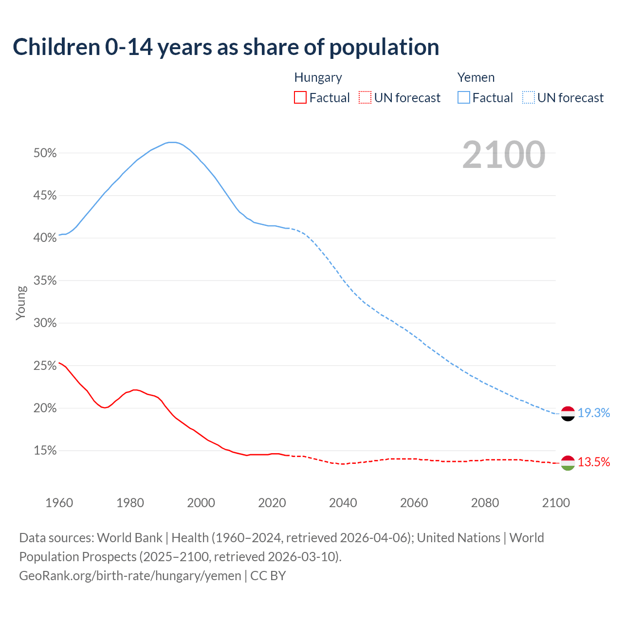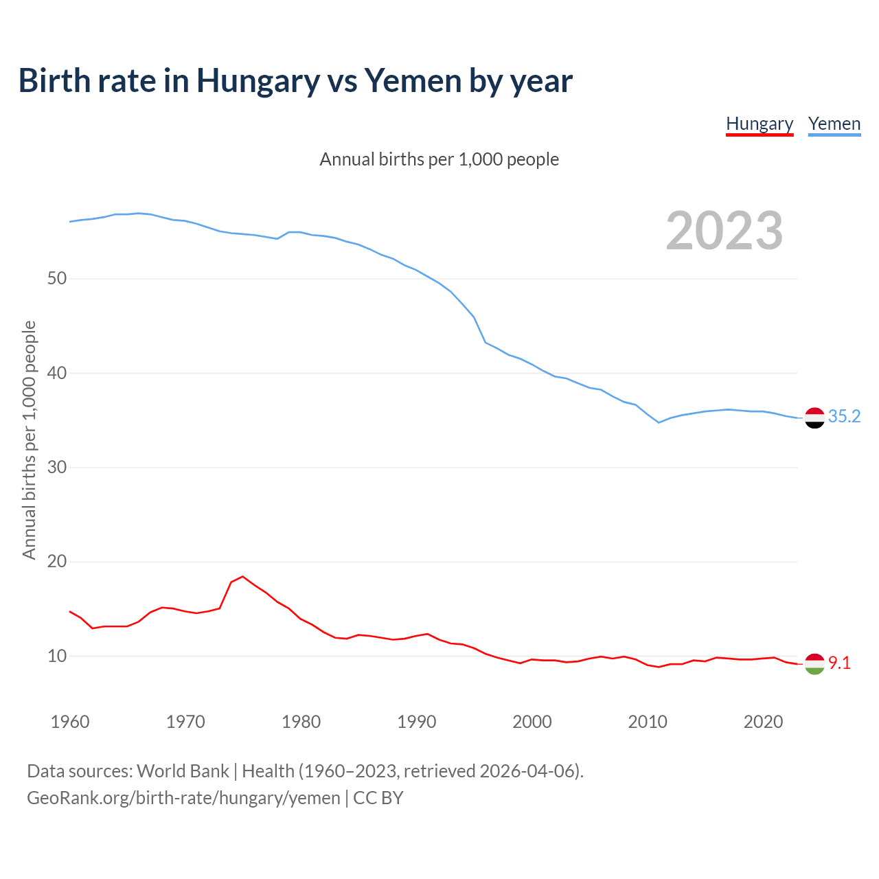 Hungary has an annual birth rate of 9.1 births per 1,000 people, compared to 35.2 for Yemen. The average number of children a woman is expected to have during her lifetime — the fertility rate, is 1.51 in Hungary and 4.59 in Yemen — 204% difference.