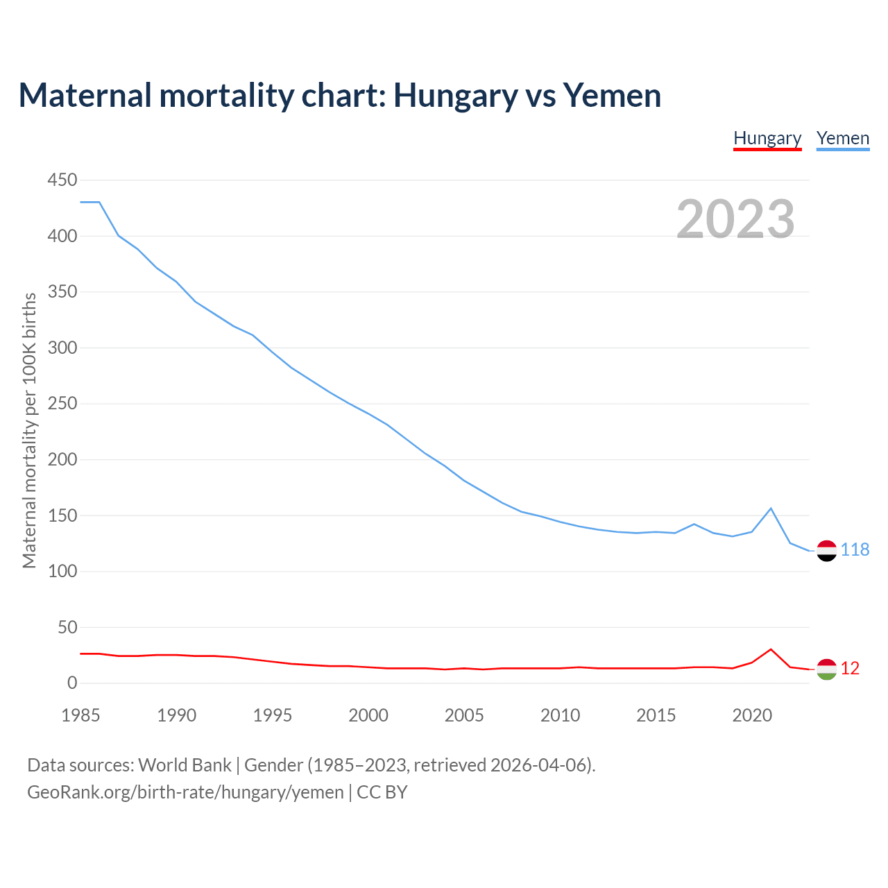 The maternal mortality rate, which is the probability of dying during childbirth or within 42 days of pregnancy termination, is 12 deaths per 100,000 live births in Hungary, compared to 118 deaths in Yemen.