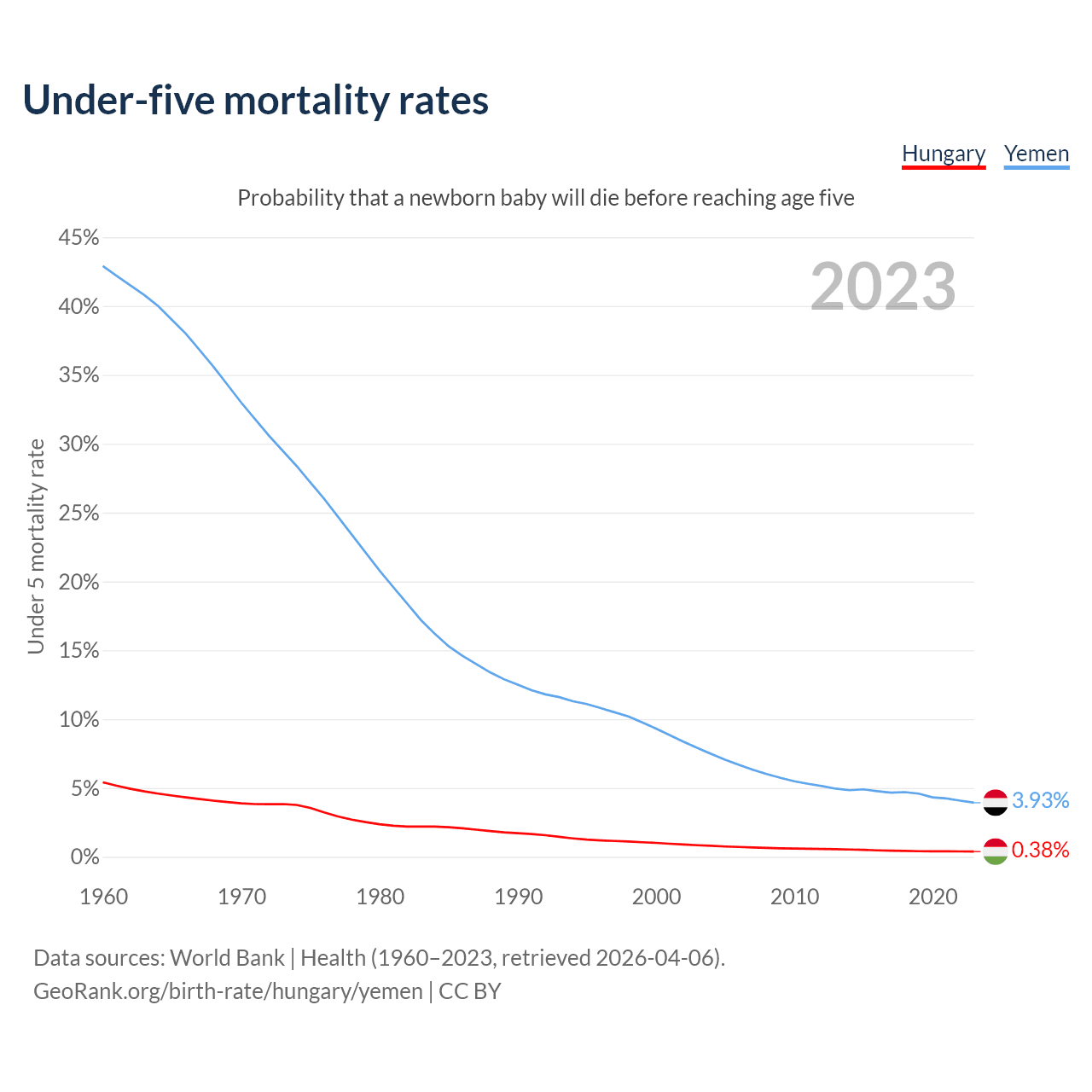 The chance that a newborn baby will die before reaching age five is 0.38% in Hungary and 3.93% in Yemen. Above is a chart with historical data on under-five mortality rates.