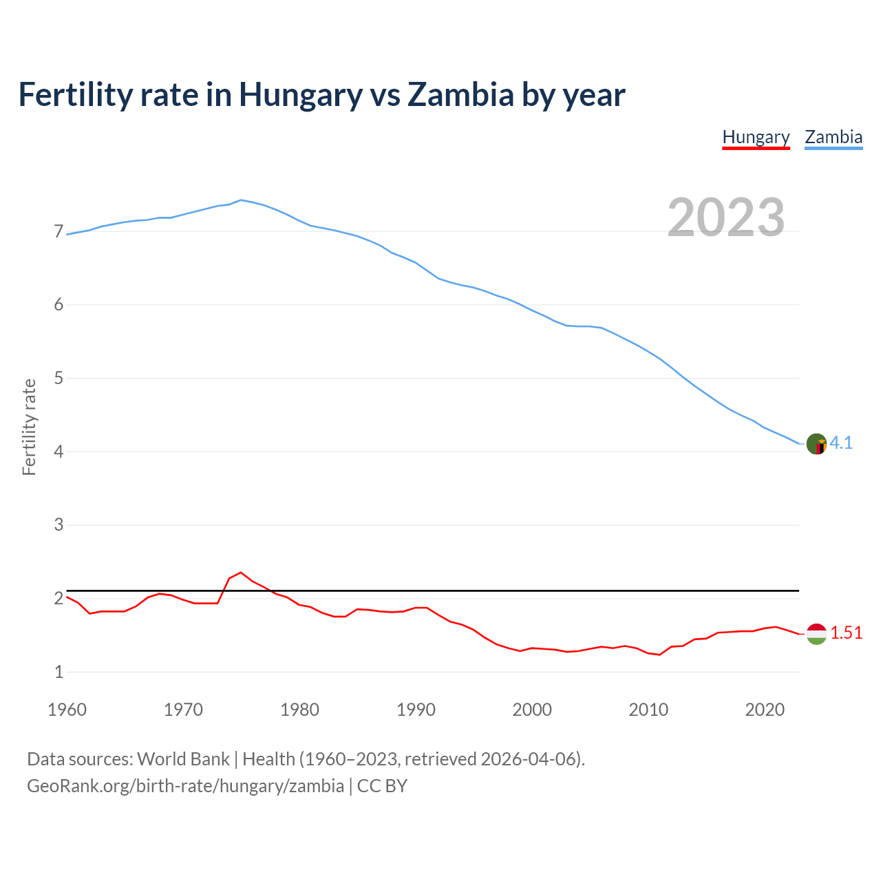 1960 vs 2023, the fertility rate has decreased by 25.2% in Hungary and by 41% in Zambia — in 1960, it was 2.02 and 6.95, respectively.