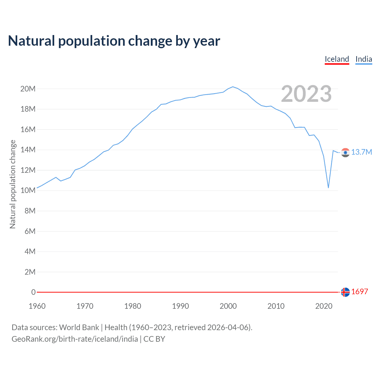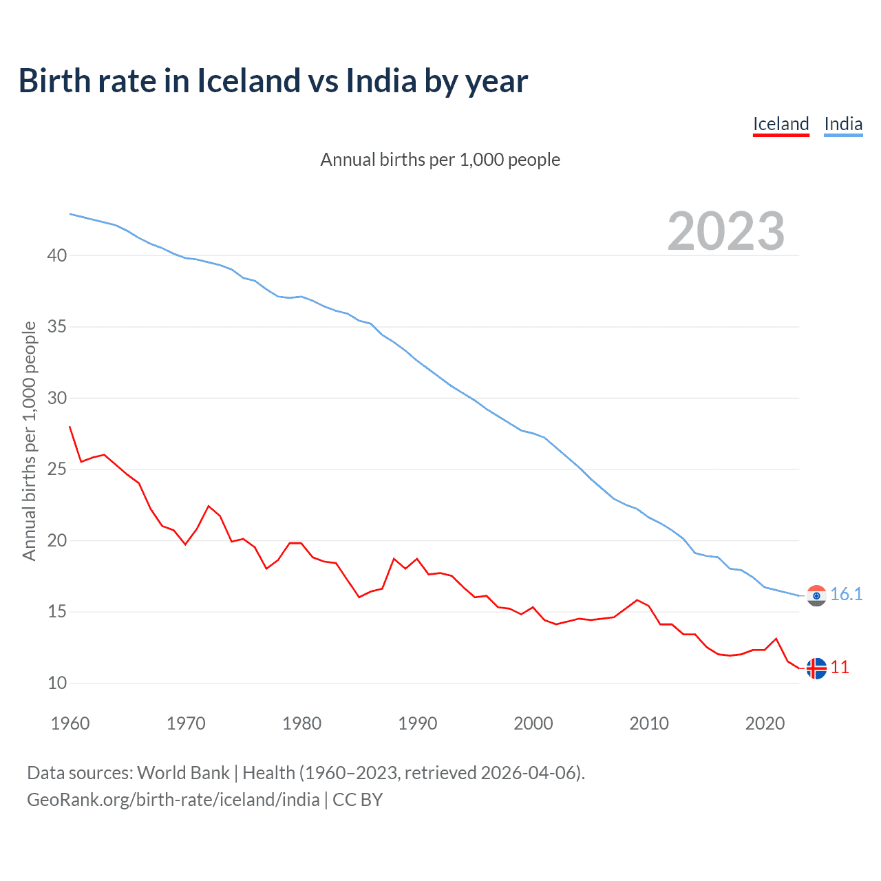 Iceland has an annual birth rate of 11 births per 1,000 people, compared to 16.1 for India. The average number of children a woman is expected to have during her lifetime — the fertility rate, is 1.59 in Iceland and 1.98 in India — 24.2% difference.