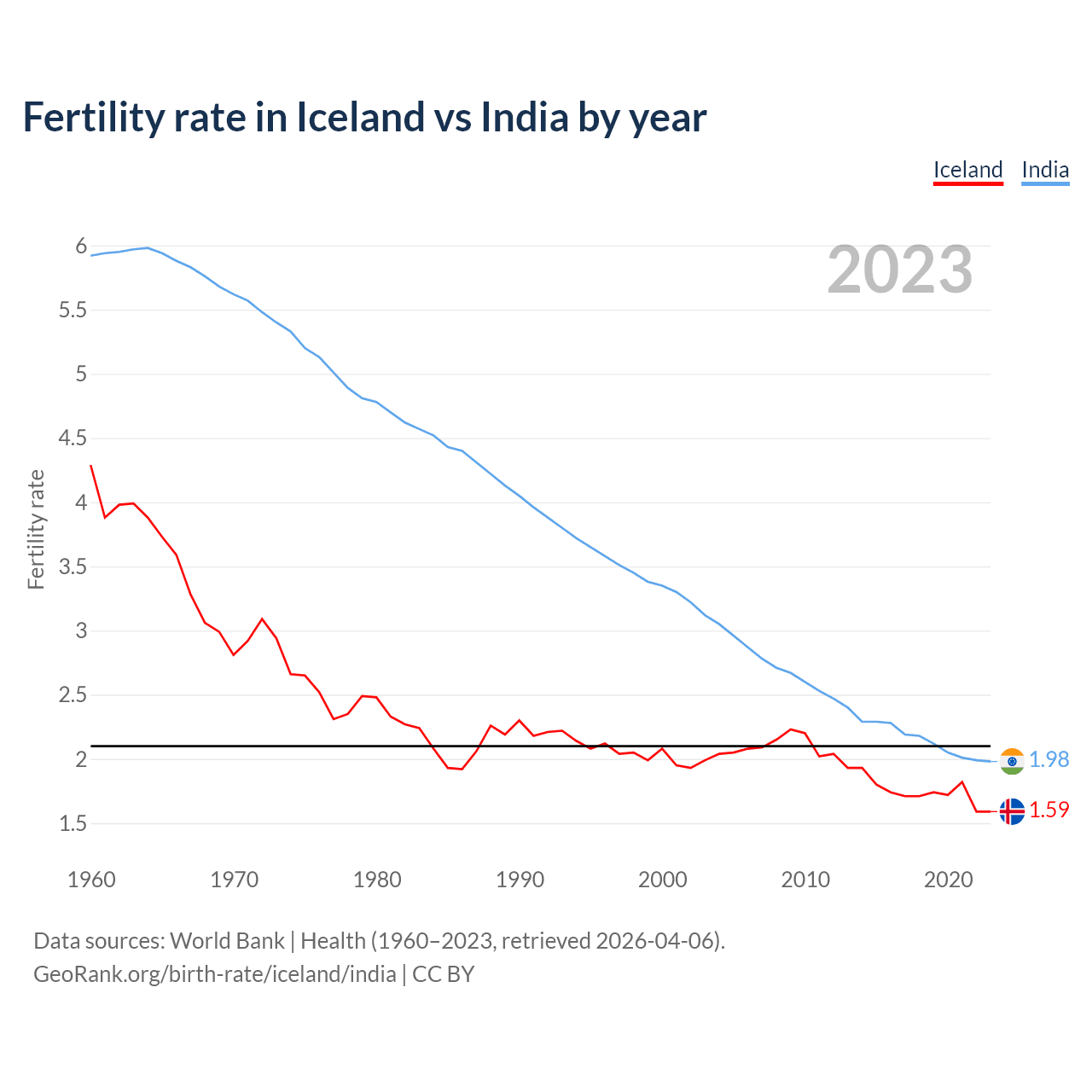 According to the latest available data on birth rates, the fertility rate in Iceland was 1.59 children per woman in 2023, compared to 1.98 in India in 2023. The replacement level is considered to be 2.1 children per woman.
