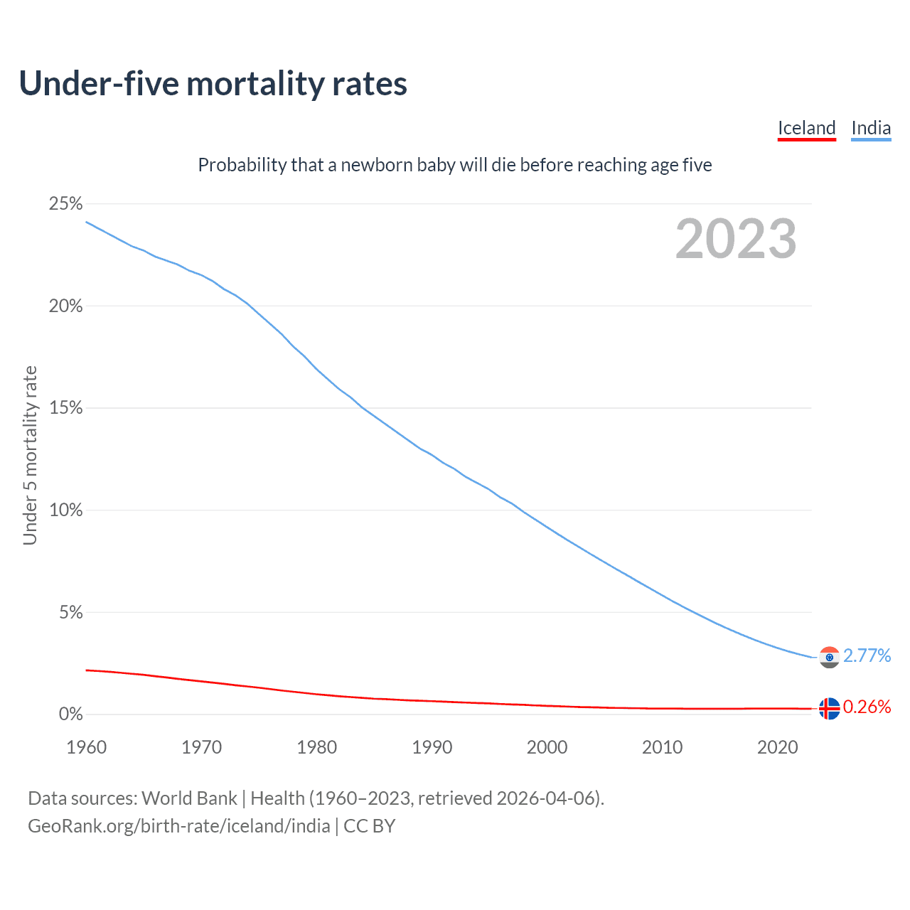 The chance that a newborn baby will die before reaching age five is 0.26% in Iceland and 2.77% in India. Above is a chart with historical data on under-five mortality rates.
