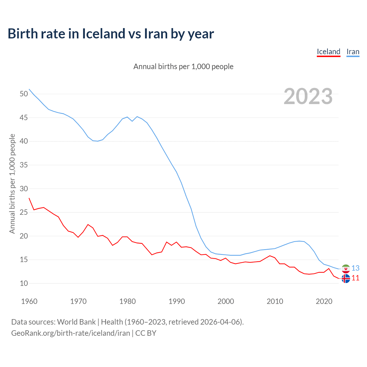 Iceland has an annual birth rate of 11 births per 1,000 people, compared to 13 for Iran. The average number of children a woman is expected to have during her lifetime — the fertility rate, is 1.59 in Iceland and 1.7 in Iran — 6.6% difference.
