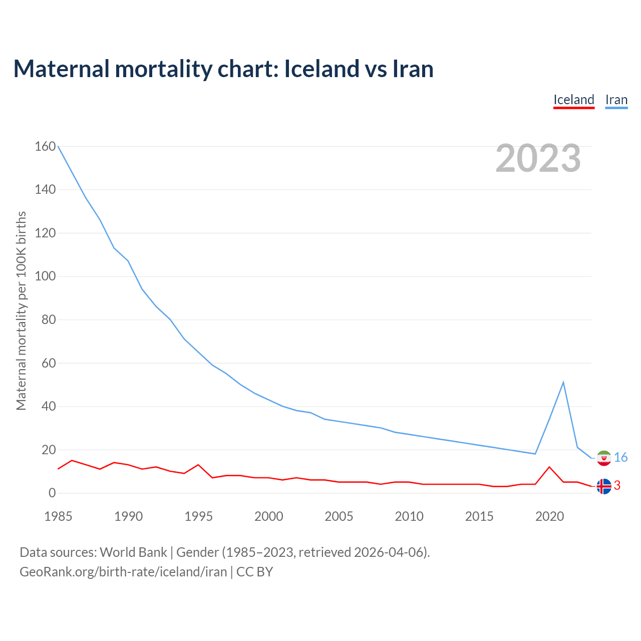 The maternal mortality rate, which is the probability of dying during childbirth or within 42 days of pregnancy termination, is 3 deaths per 100,000 live births in Iceland, compared to 16 deaths in Iran.