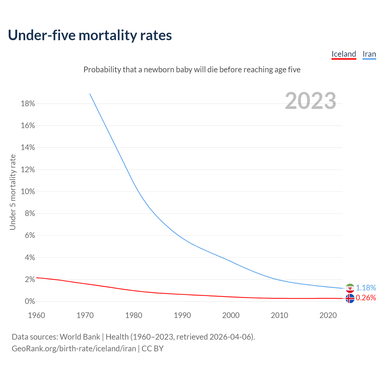 The chance that a newborn baby will die before reaching age five is 0.26% in Iceland and 1.18% in Iran. Above is a chart with historical data on under-five mortality rates.