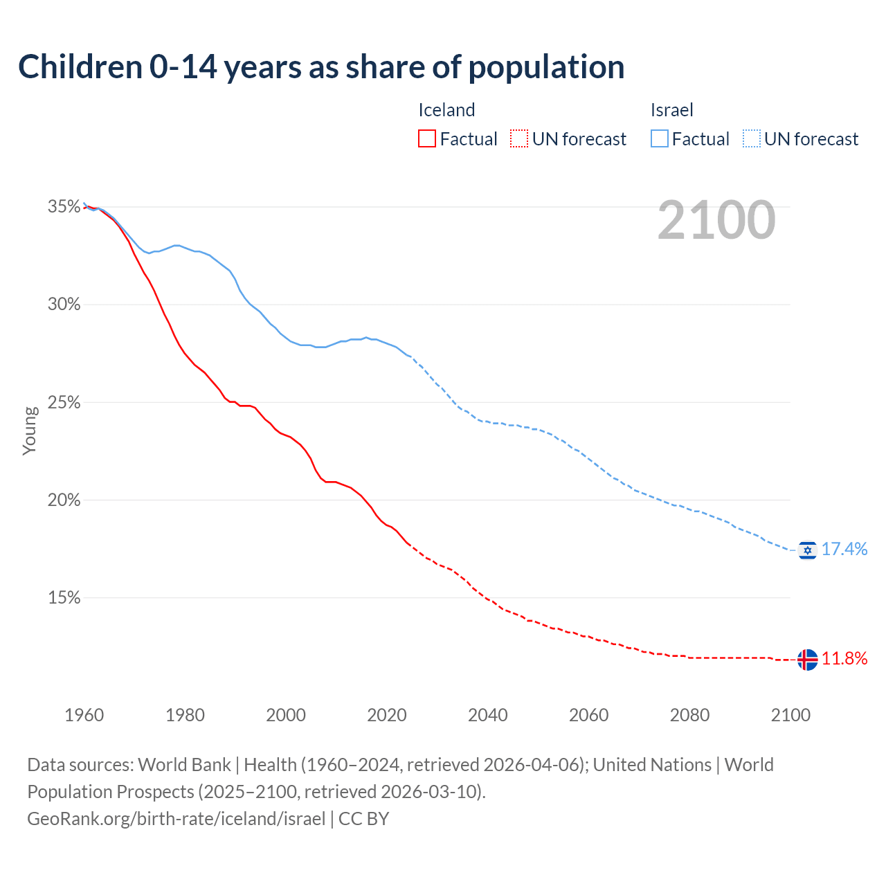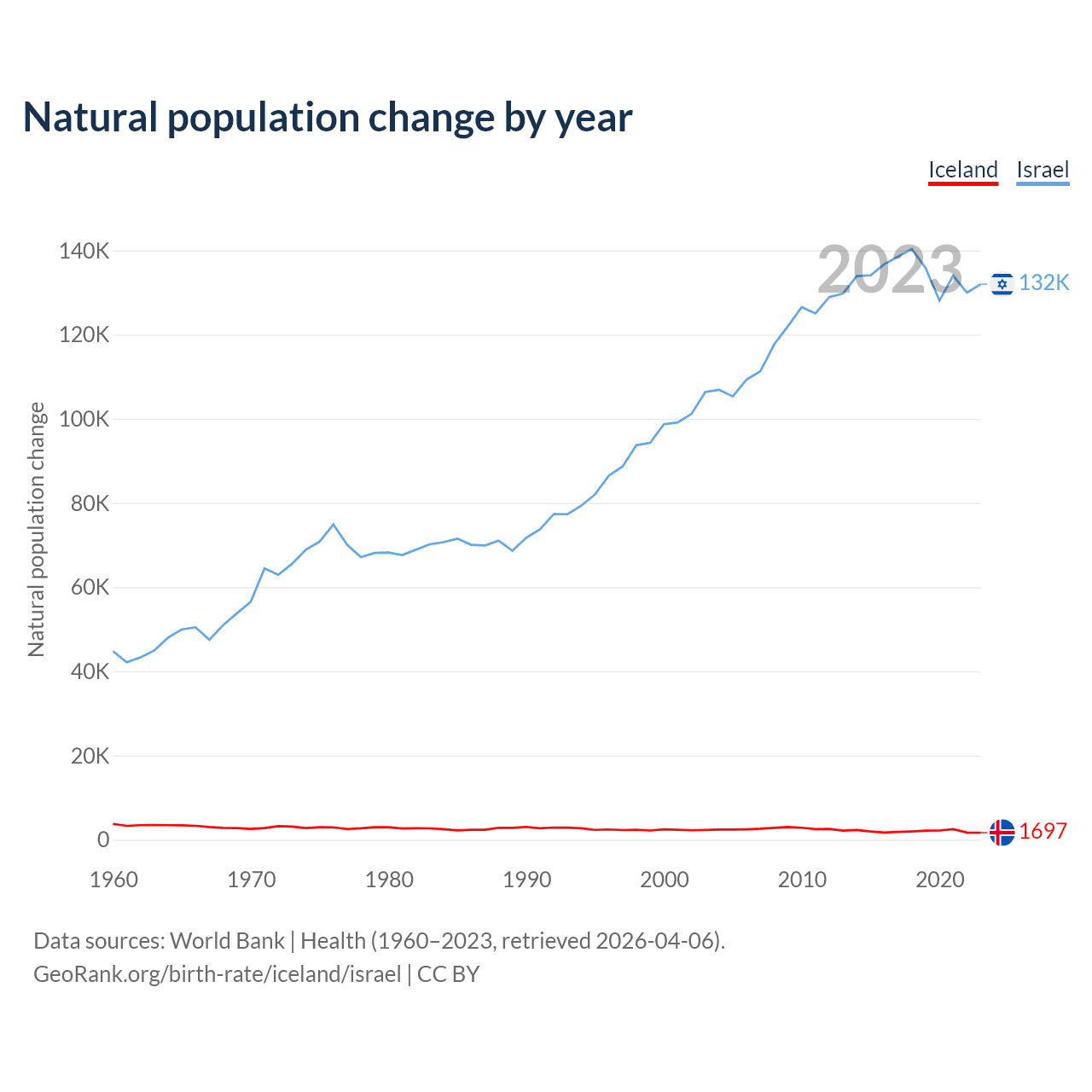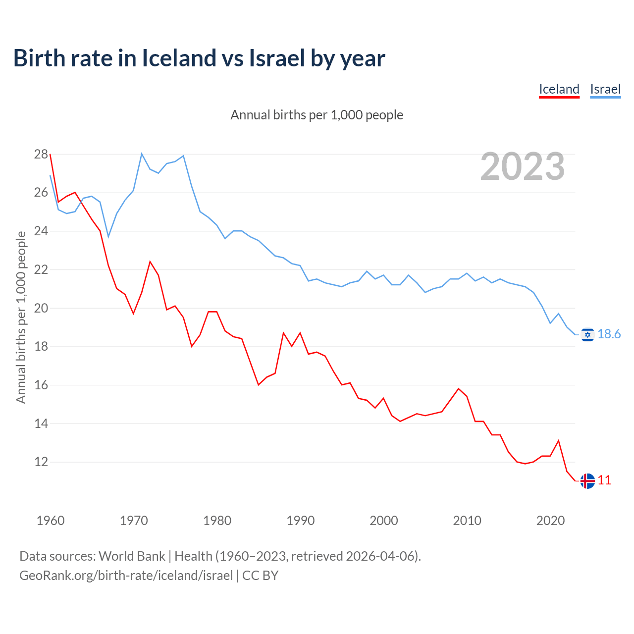Iceland has an annual birth rate of 11 births per 1,000 people, compared to 18.6 for Israel. The average number of children a woman is expected to have during her lifetime — the fertility rate, is 1.59 in Iceland and 2.85 in Israel — 79.2% difference.