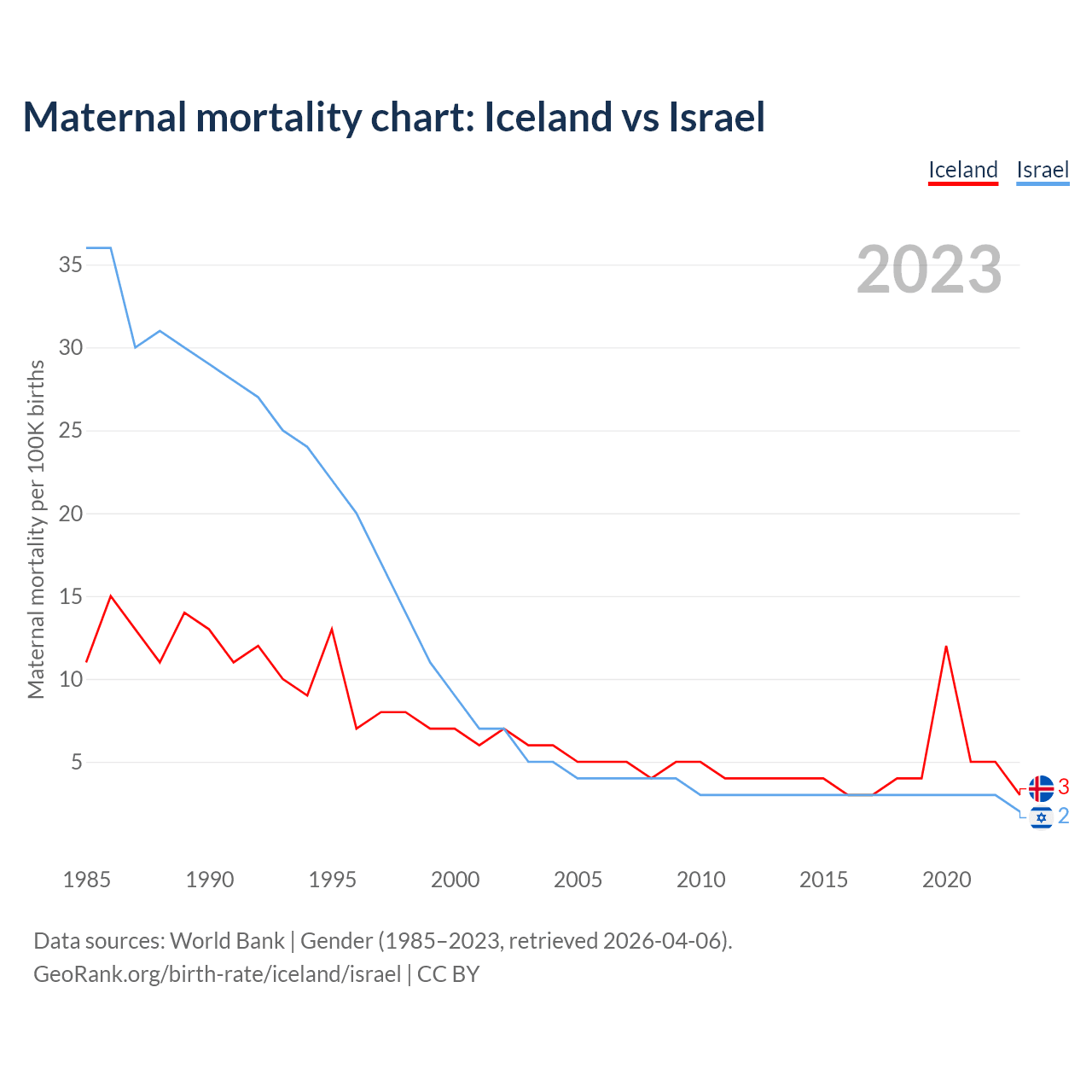 The maternal mortality rate, which is the probability of dying during childbirth or within 42 days of pregnancy termination, is 3 deaths per 100,000 live births in Iceland, compared to 2 deaths in Israel.