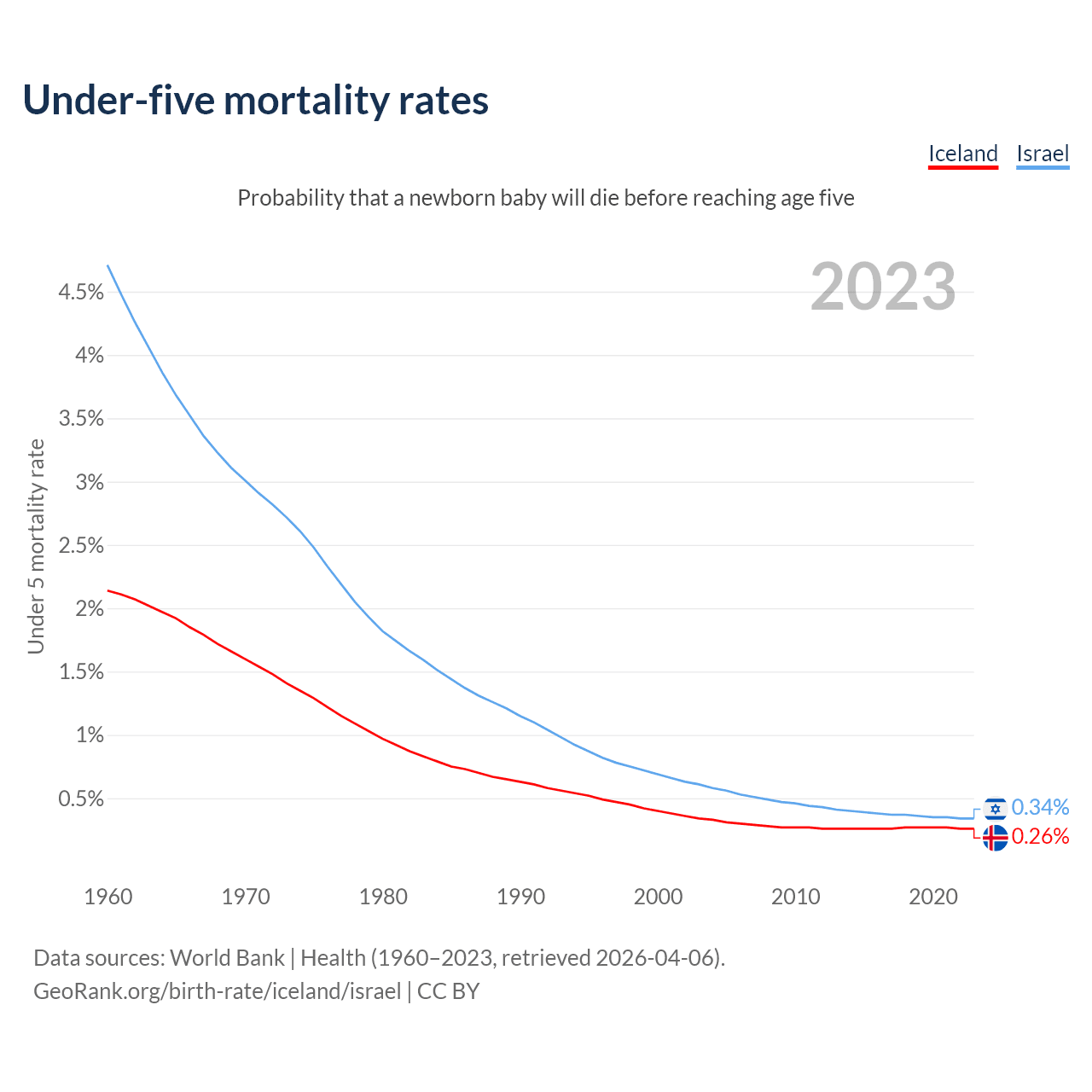 The chance that a newborn baby will die before reaching age five is 0.26% in Iceland and 0.34% in Israel. Above is a chart with historical data on under-five mortality rates.