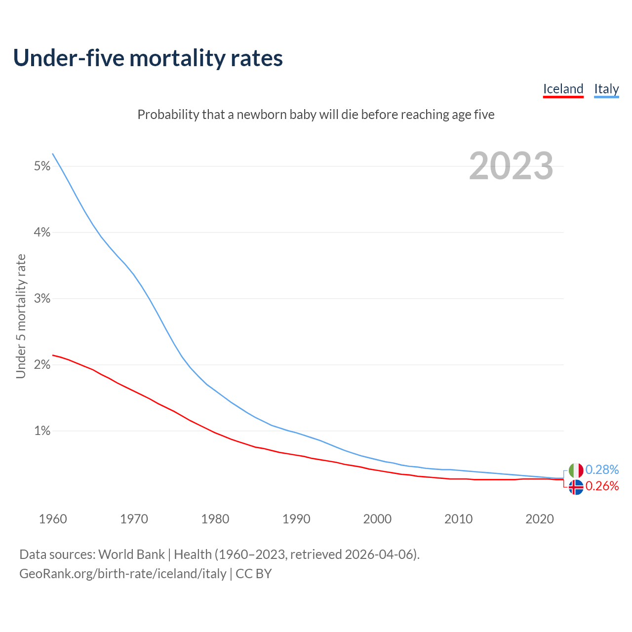 The chance that a newborn baby will die before reaching age five is 0.26% in Iceland and 0.28% in Italy. Above is a chart with historical data on under-five mortality rates.
