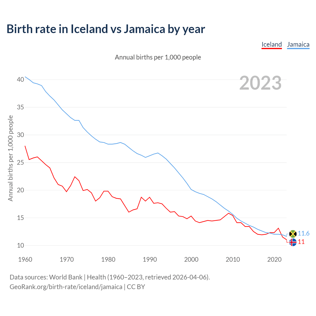 Iceland has an annual birth rate of 11 births per 1,000 people, compared to 11.6 for Jamaica. The average number of children a woman is expected to have during her lifetime — the fertility rate, is 1.59 in Iceland and 1.36 in Jamaica — 14.6% difference.