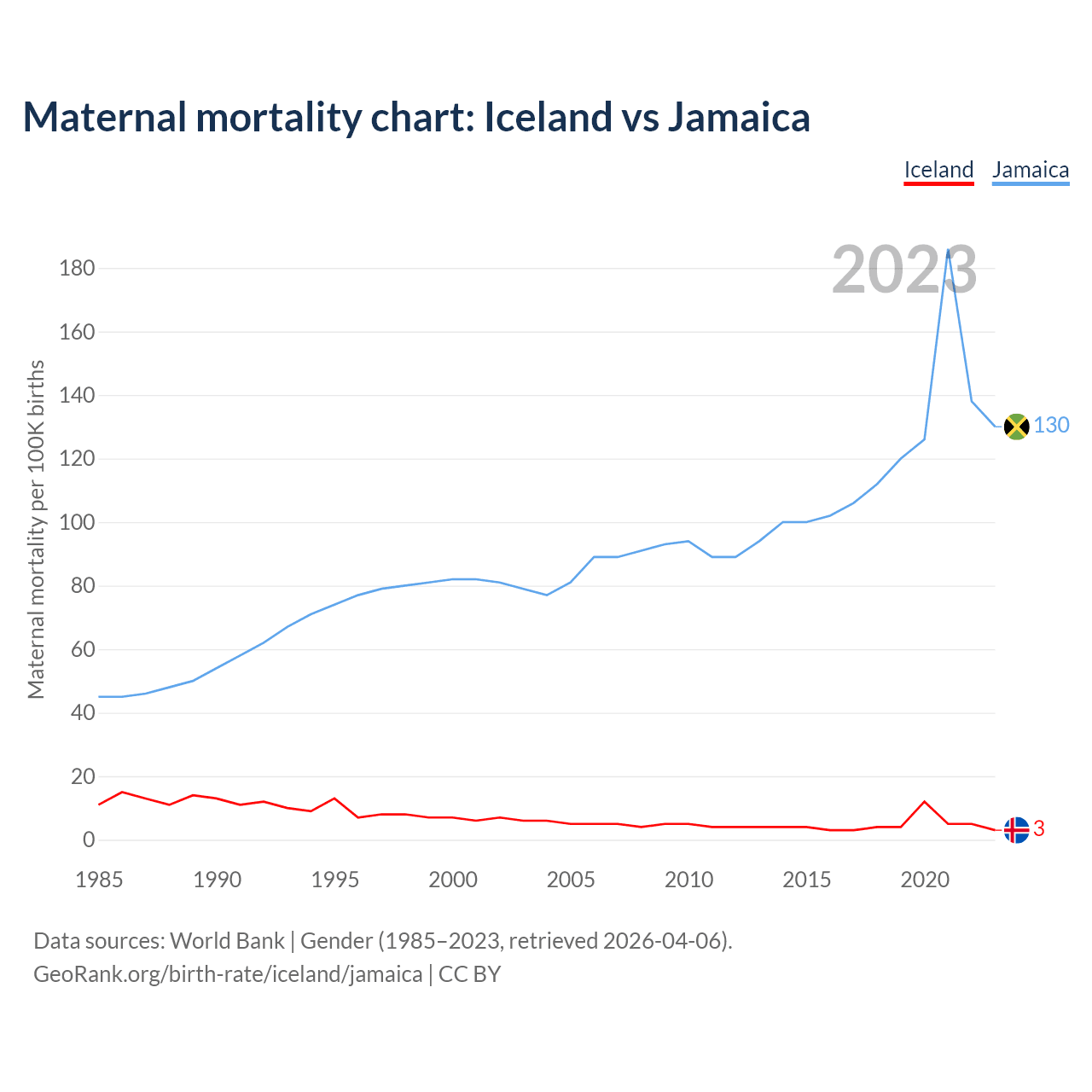 The maternal mortality rate, which is the probability of dying during childbirth or within 42 days of pregnancy termination, is 3 deaths per 100,000 live births in Iceland, compared to 130 deaths in Jamaica.