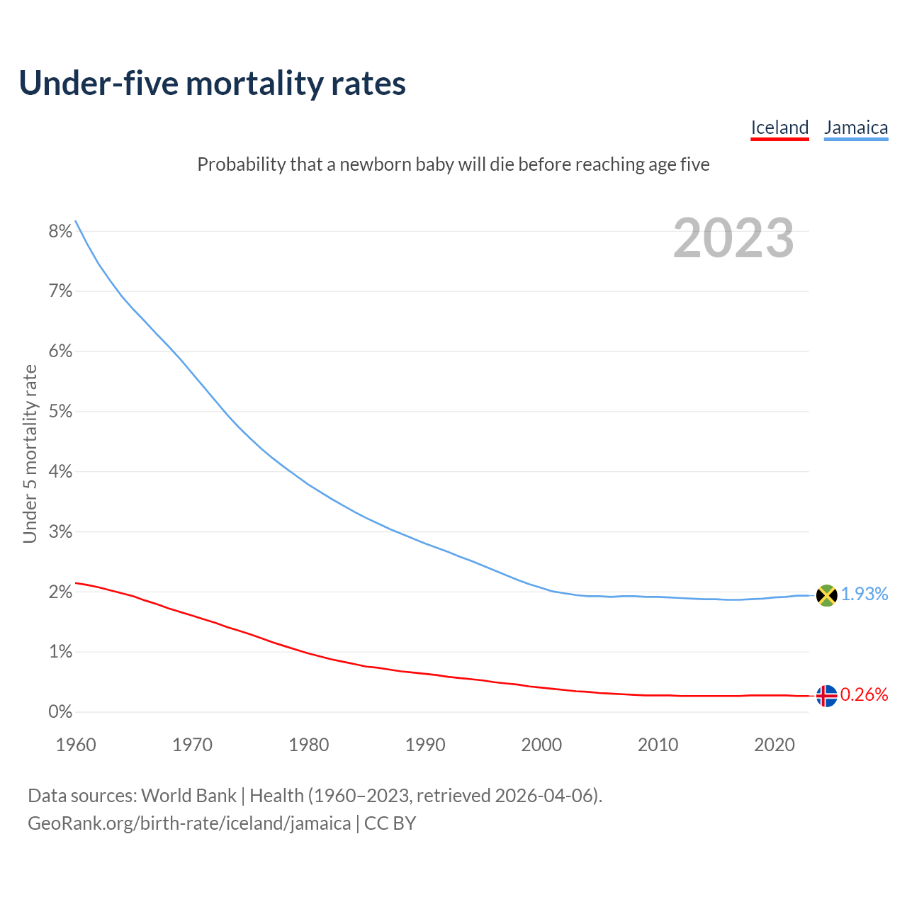 The chance that a newborn baby will die before reaching age five is 0.26% in Iceland and 1.93% in Jamaica. Above is a chart with historical data on under-five mortality rates.