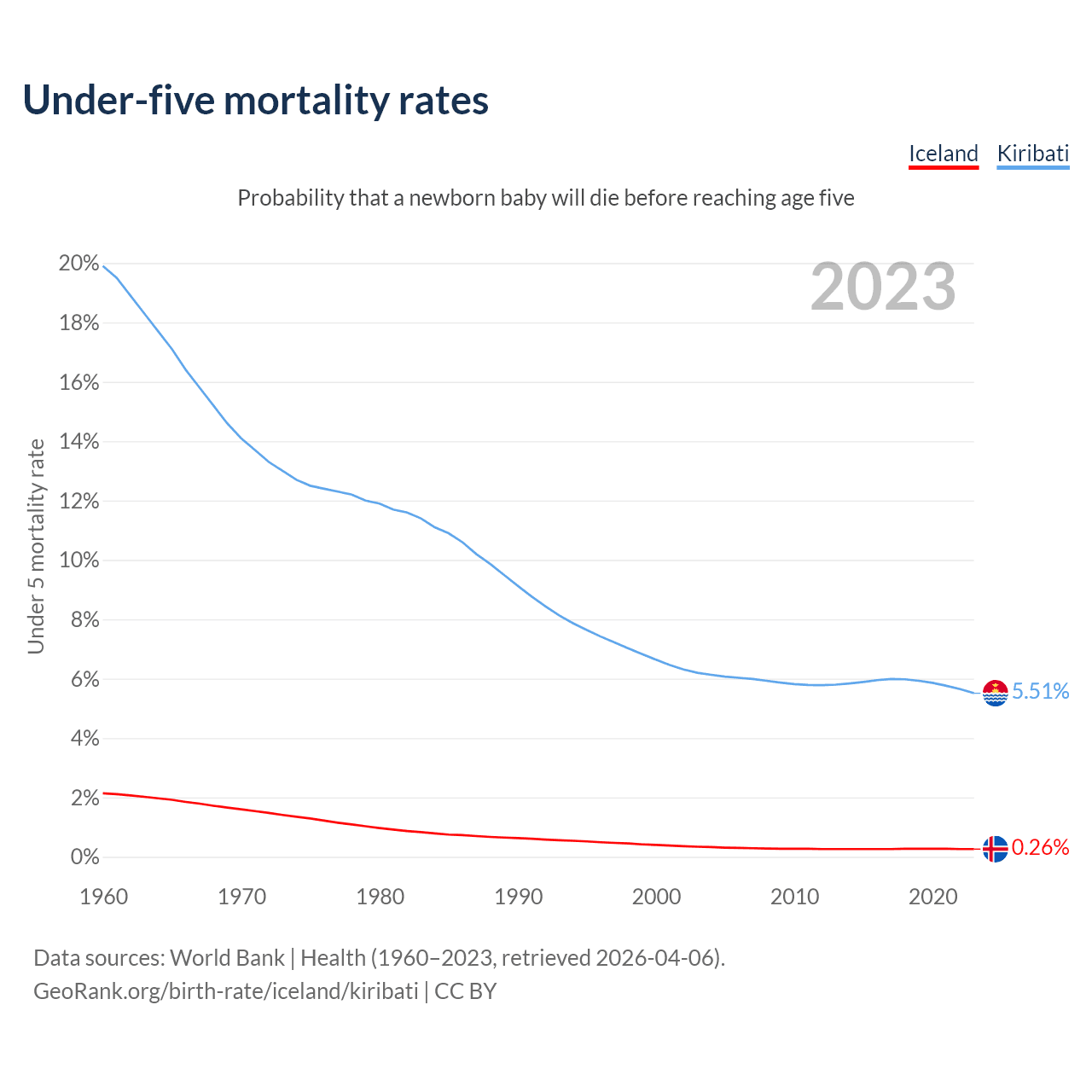 The chance that a newborn baby will die before reaching age five is 0.26% in Iceland and 5.51% in Kiribati. Above is a chart with historical data on under-five mortality rates.