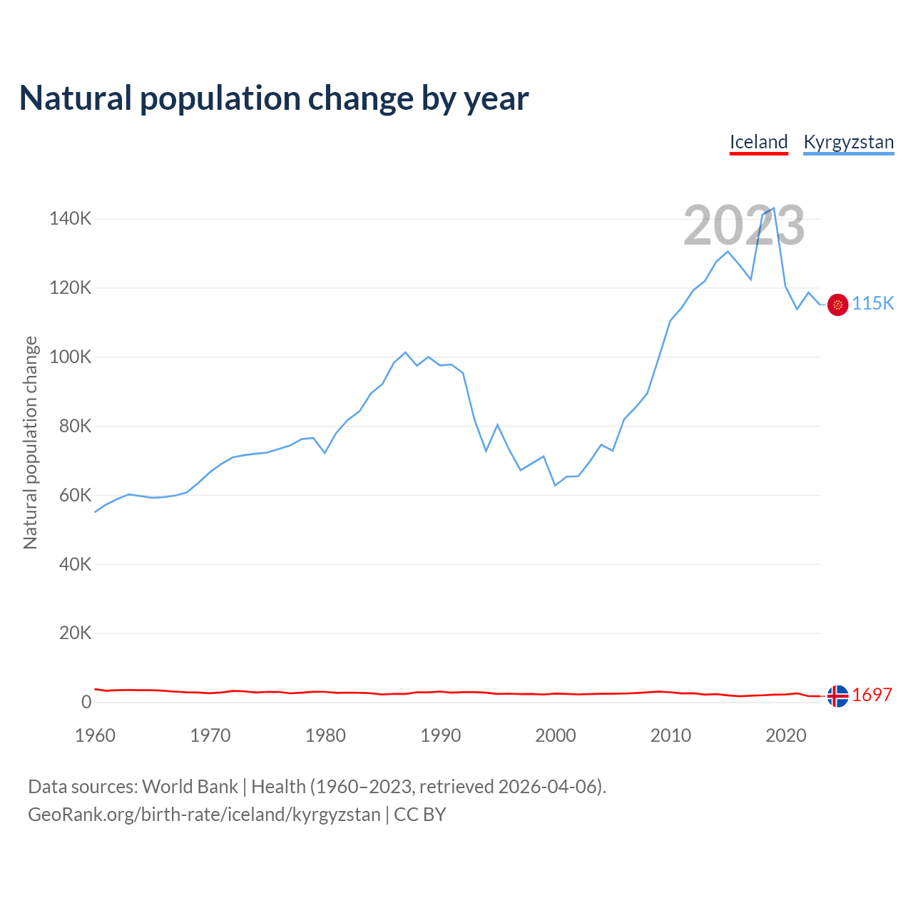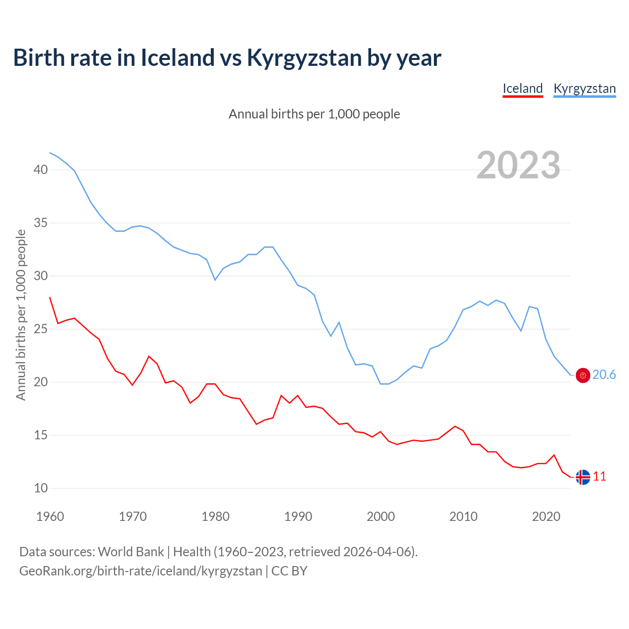 Iceland has an annual birth rate of 11 births per 1,000 people, compared to 20.6 for Kyrgyzstan. The average number of children a woman is expected to have during her lifetime — the fertility rate, is 1.59 in Iceland and 2.7 in Kyrgyzstan — 69.8% difference.