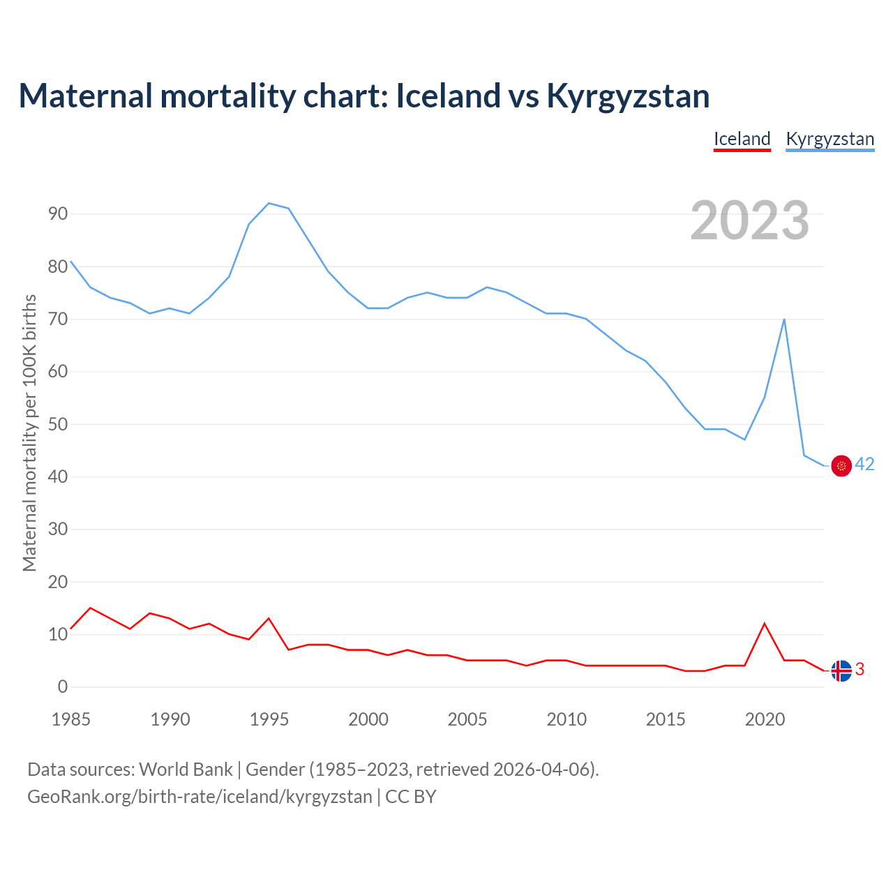 The maternal mortality rate, which is the probability of dying during childbirth or within 42 days of pregnancy termination, is 3 deaths per 100,000 live births in Iceland, compared to 42 deaths in Kyrgyzstan.