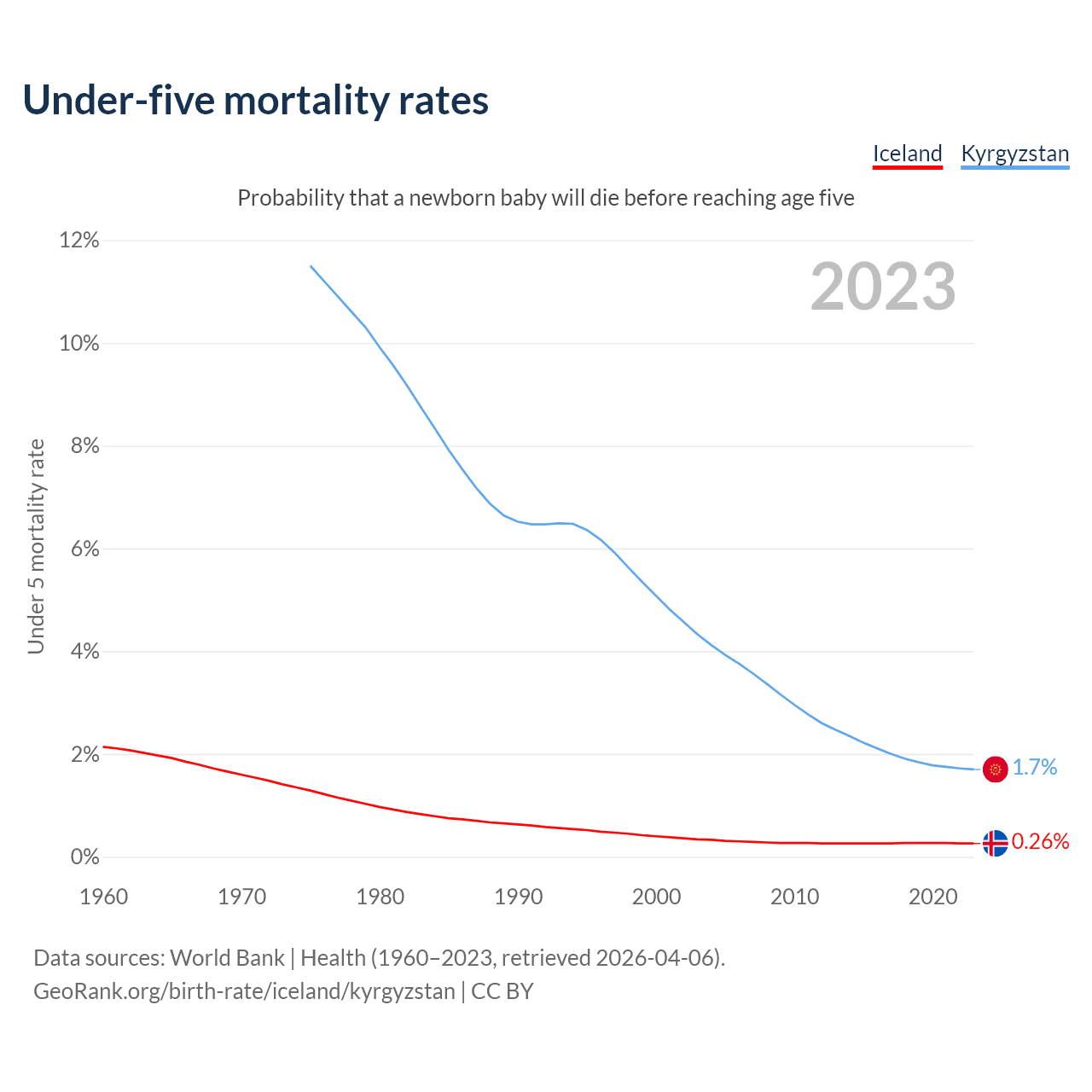 The chance that a newborn baby will die before reaching age five is 0.26% in Iceland and 1.7% in Kyrgyzstan. Above is a chart with historical data on under-five mortality rates.