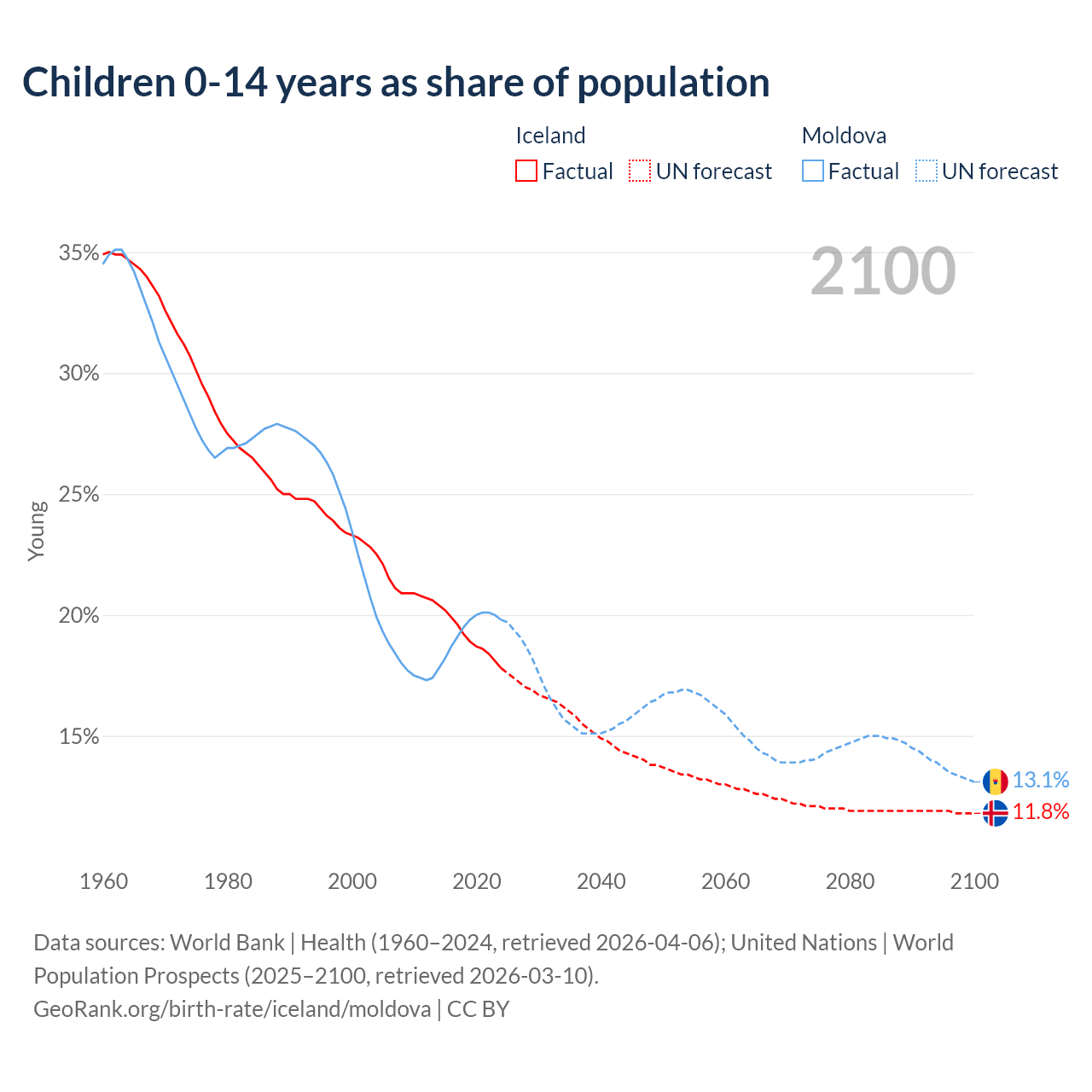 Iceland has an annual birth rate of 11 births per 1,000 people, compared to 10.8 for Moldova. The average number of children a woman is expected to have during her lifetime — the fertility rate, is 1.59 in Iceland and 1.73 in Moldova — 8.87% difference.