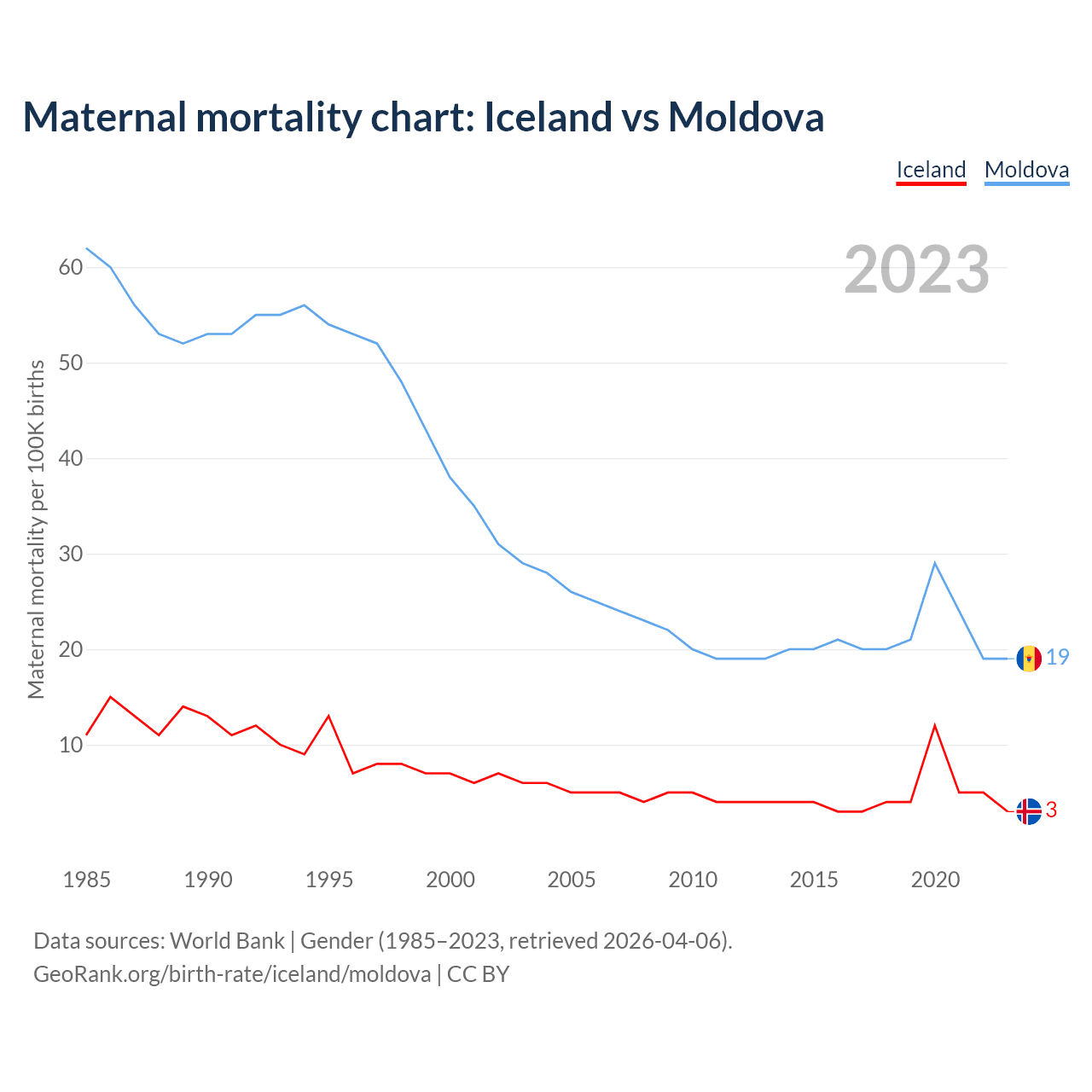 The maternal mortality rate, which is the probability of dying during childbirth or within 42 days of pregnancy termination, is 3 deaths per 100,000 live births in Iceland, compared to 19 deaths in Moldova.