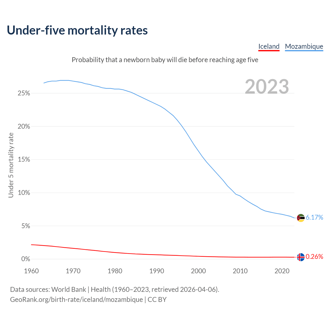 The chance that a newborn baby will die before reaching age five is 0.26% in Iceland and 6.17% in Mozambique. Above is a chart with historical data on under-five mortality rates.