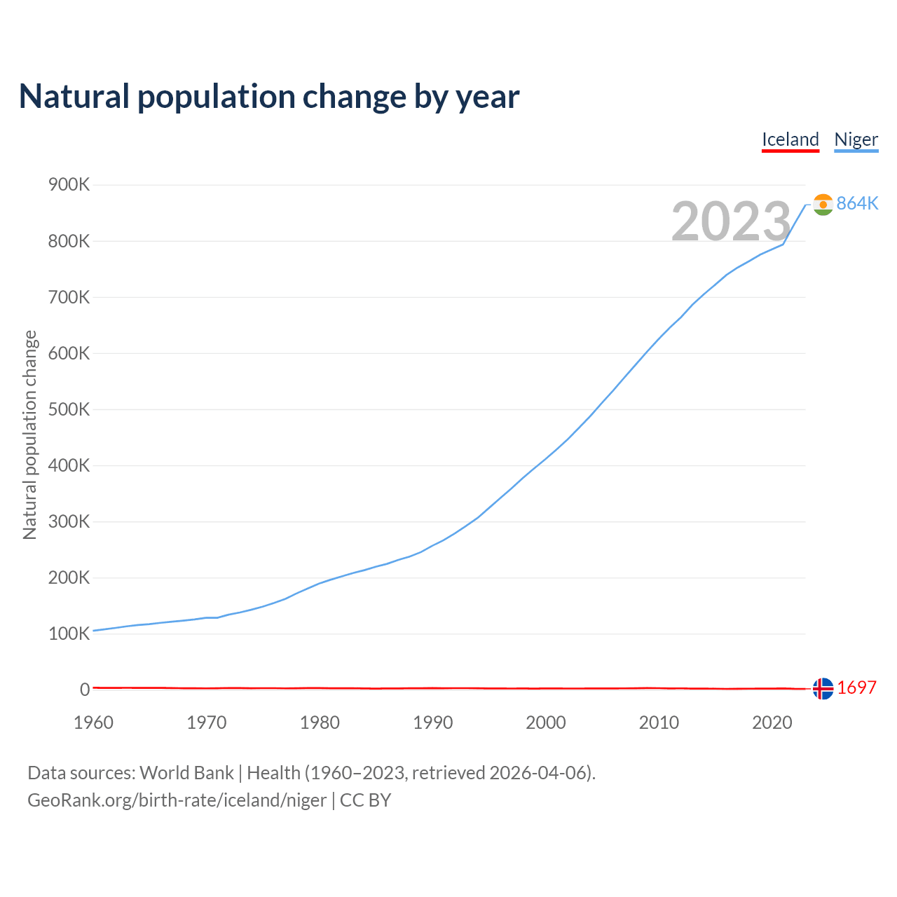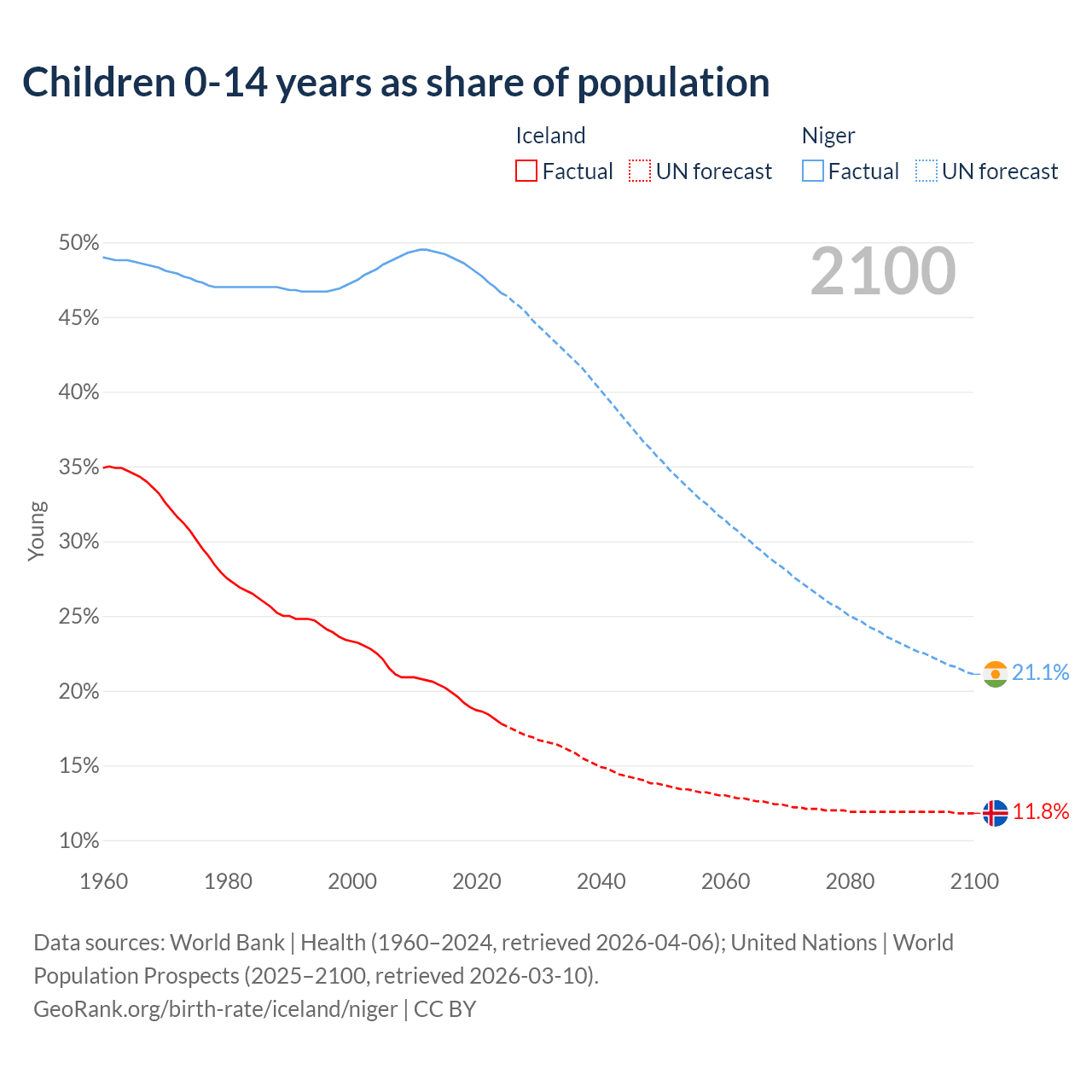 Iceland has an annual birth rate of 11 births per 1,000 people, compared to 41.9 for Niger. The average number of children a woman is expected to have during her lifetime — the fertility rate, is 1.59 in Iceland and 6.06 in Niger — 281.2% difference.