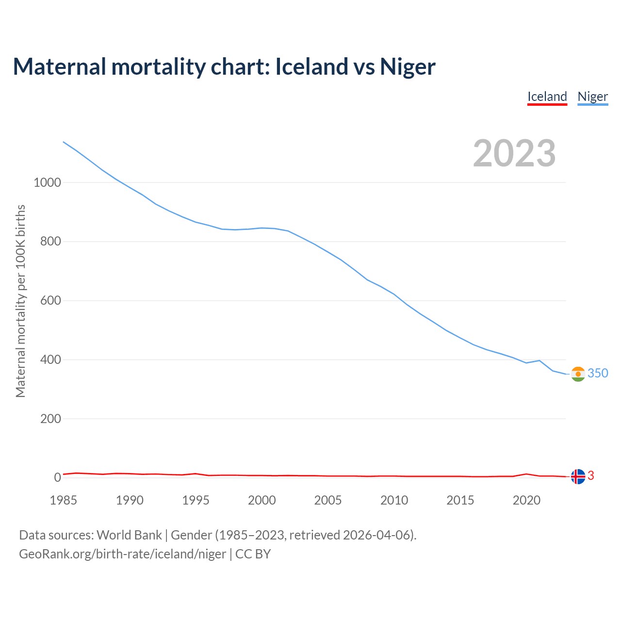The maternal mortality rate, which is the probability of dying during childbirth or within 42 days of pregnancy termination, is 3 deaths per 100,000 live births in Iceland, compared to 350 deaths in Niger.