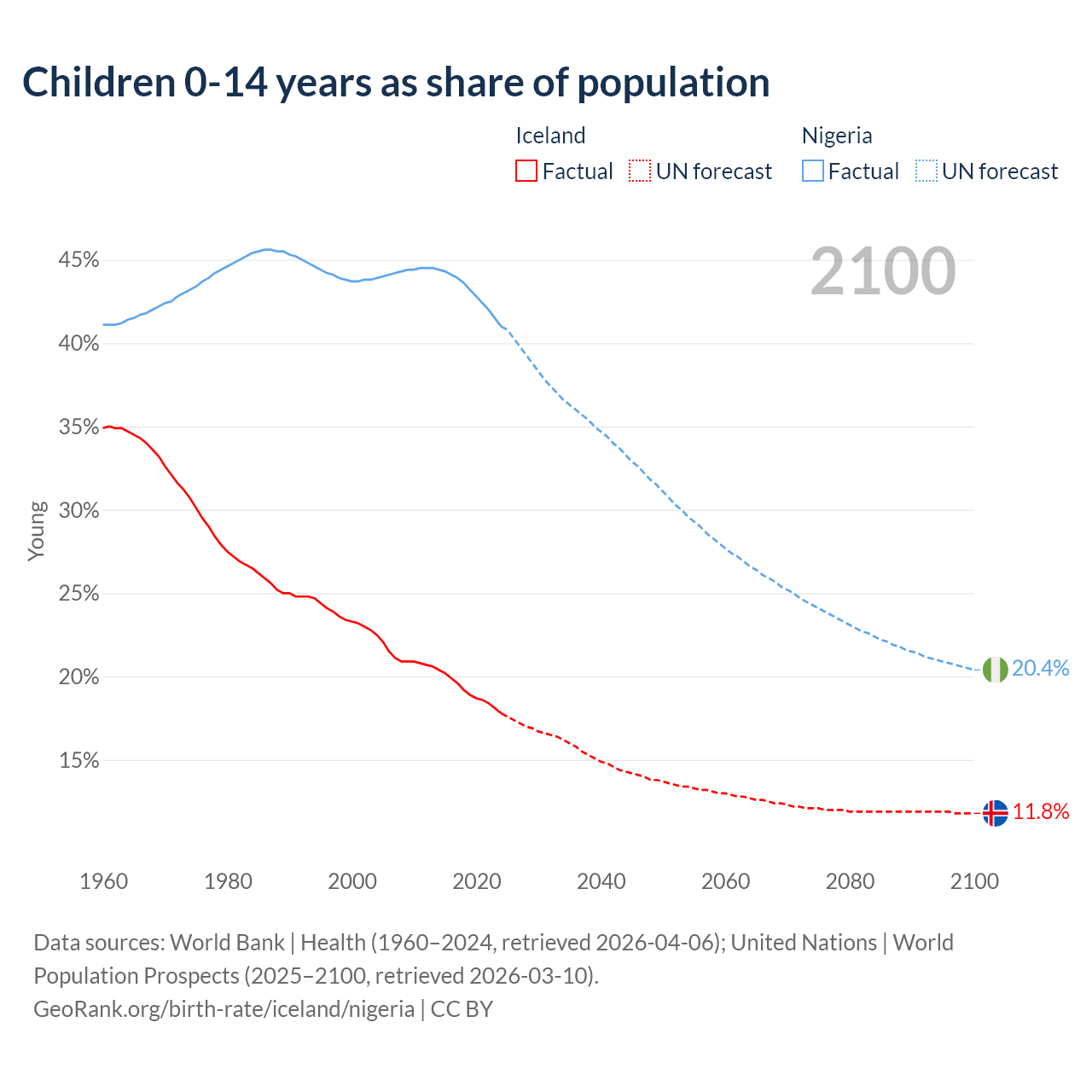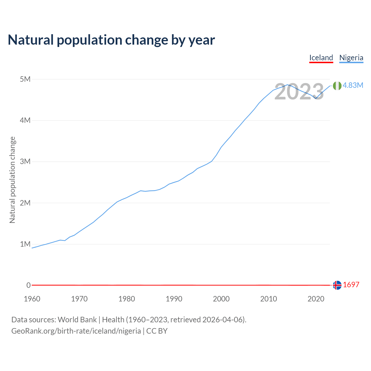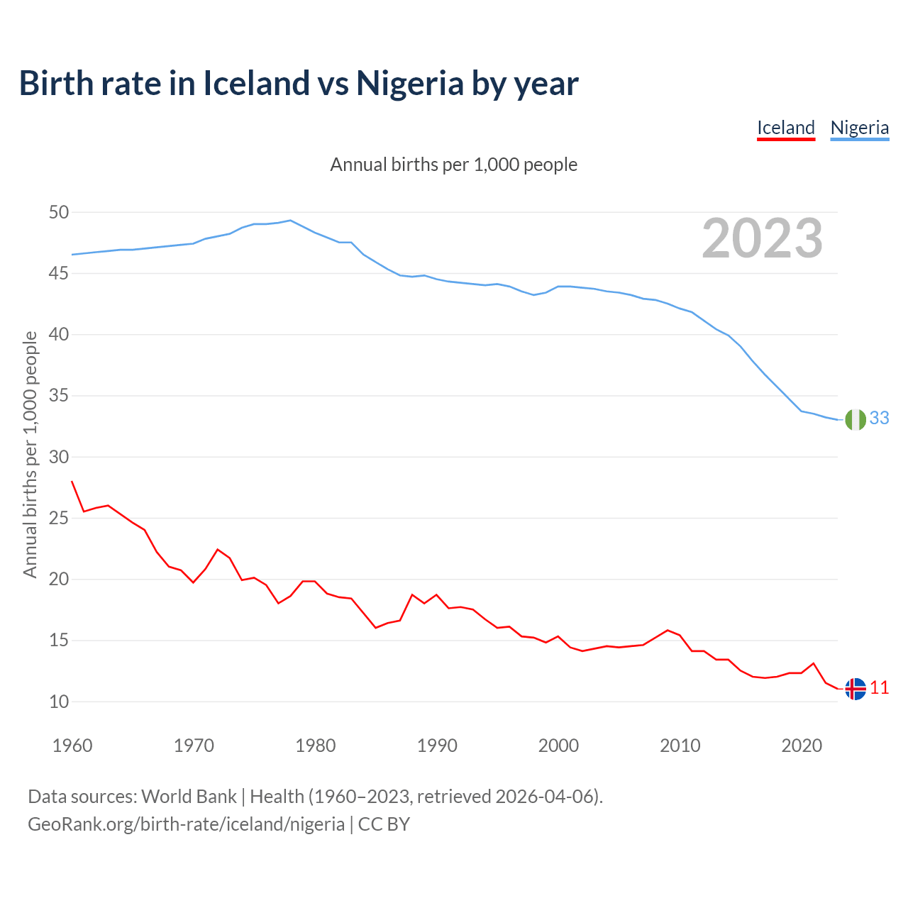 Iceland has an annual birth rate of 11 births per 1,000 people, compared to 33 for Nigeria. The average number of children a woman is expected to have during her lifetime — the fertility rate, is 1.59 in Iceland and 4.48 in Nigeria — 181.9% difference.