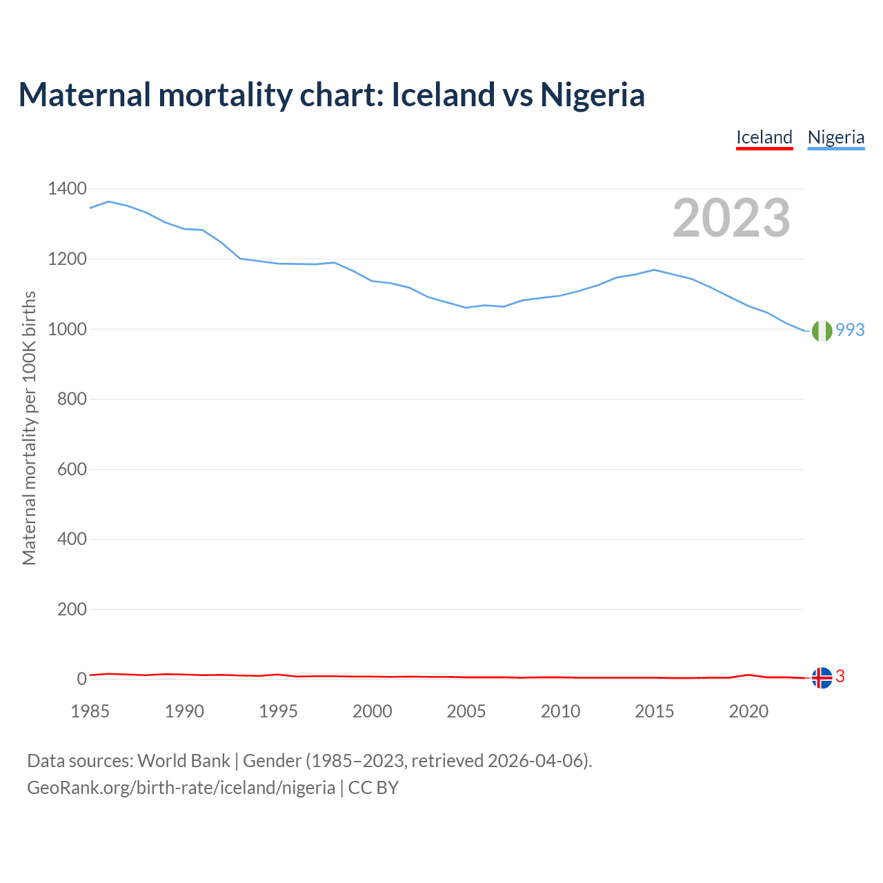 The maternal mortality rate, which is the probability of dying during childbirth or within 42 days of pregnancy termination, is 3 deaths per 100,000 live births in Iceland, compared to 993 deaths in Nigeria.