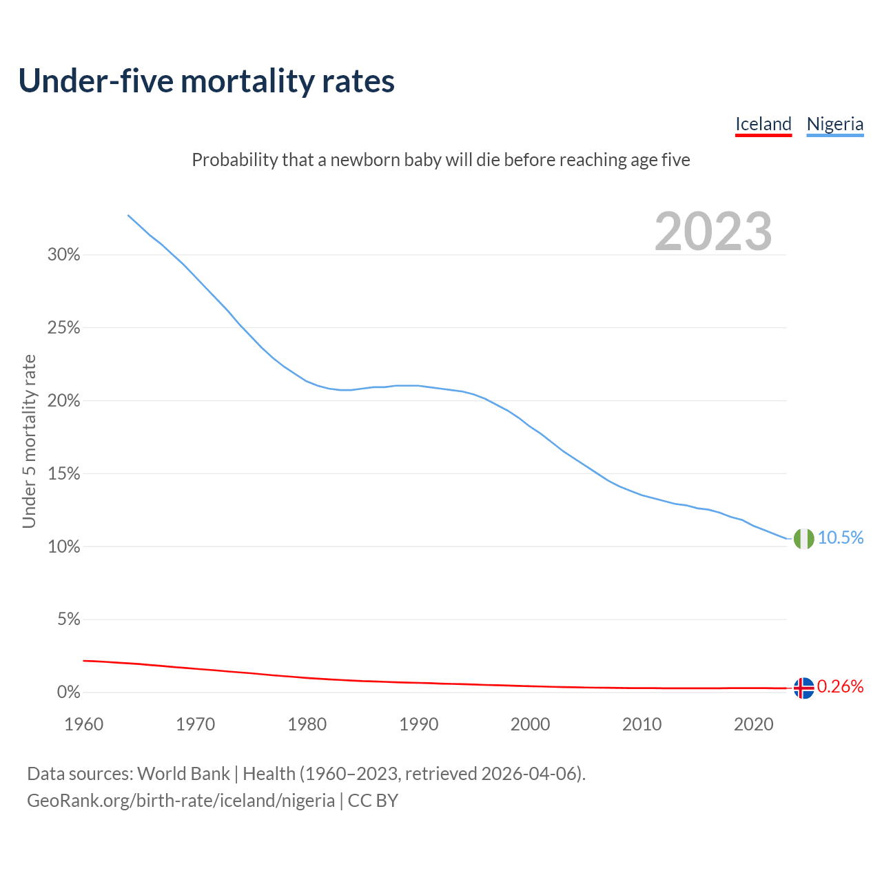 The chance that a newborn baby will die before reaching age five is 0.26% in Iceland and 10.5% in Nigeria. Above is a chart with historical data on under-five mortality rates.