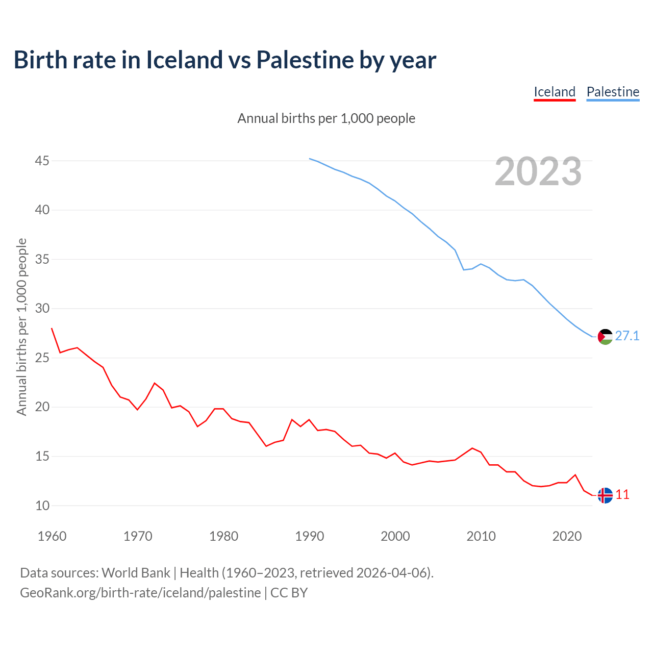 Iceland has an annual birth rate of 11 births per 1,000 people, compared to 27.1 for Palestine. The average number of children a woman is expected to have during her lifetime — the fertility rate, is 1.59 in Iceland and 3.31 in Palestine — 108.2% difference.