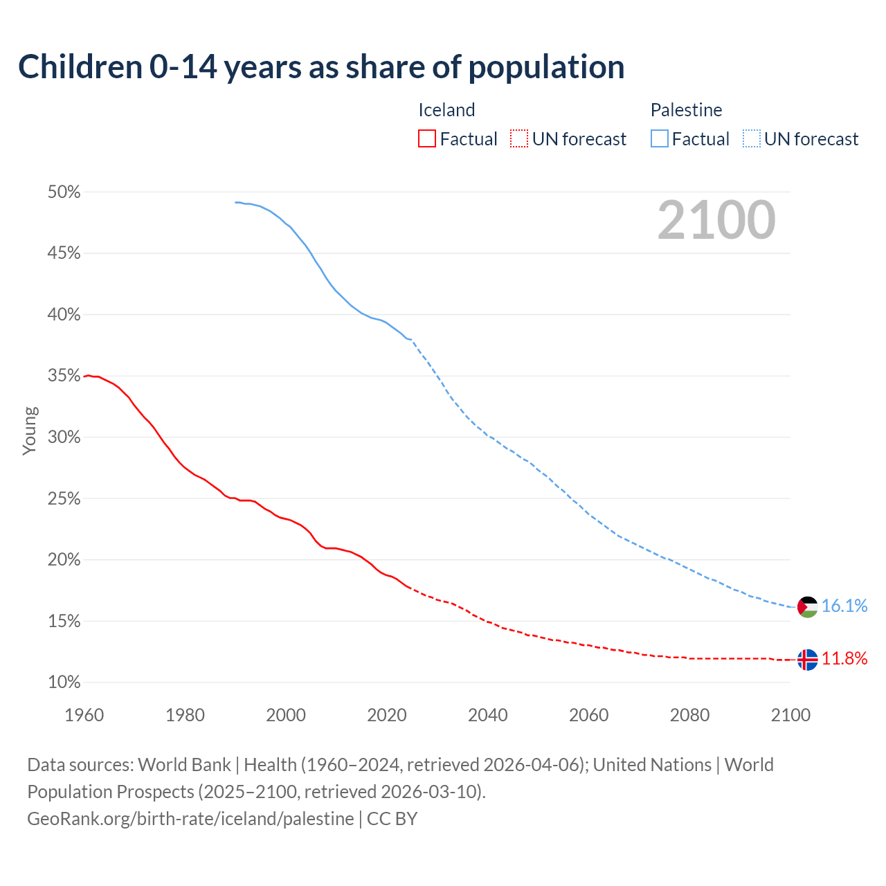 According to the latest available data on birth rates, the fertility rate in Iceland was 1.59 children per woman in 2023, compared to 3.31 in Palestine in 2023. The replacement level is considered to be 2.1 children per woman.