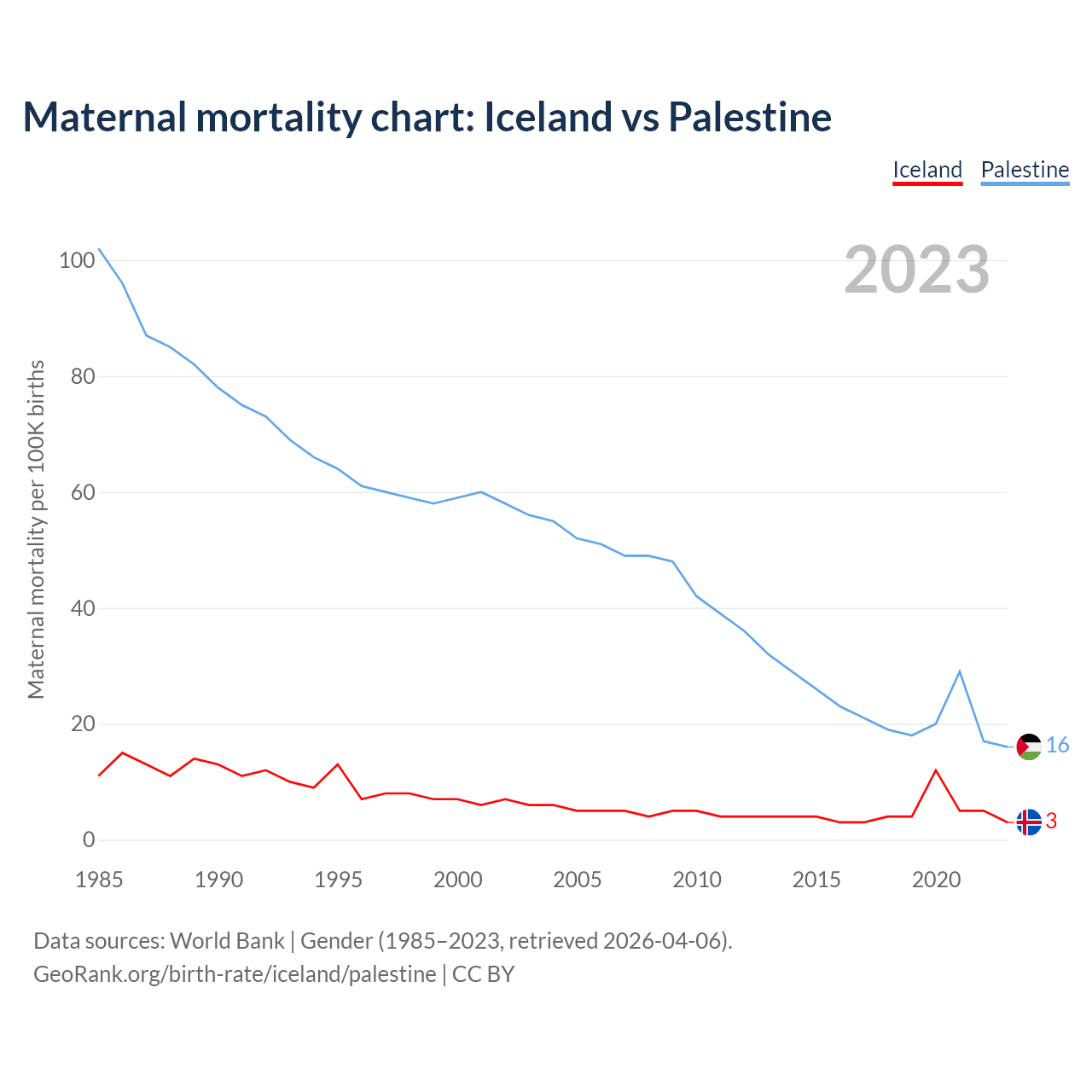 The maternal mortality rate, which is the probability of dying during childbirth or within 42 days of pregnancy termination, is 3 deaths per 100,000 live births in Iceland, compared to 16 deaths in Palestine.