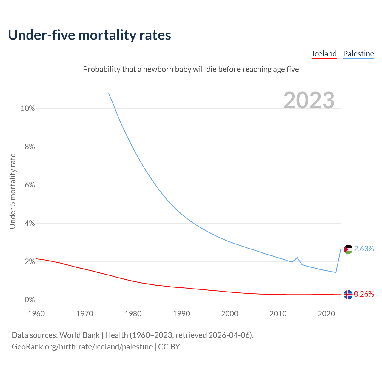 The chance that a newborn baby will die before reaching age five is 0.26% in Iceland and 2.63% in Palestine. Above is a chart with historical data on under-five mortality rates.